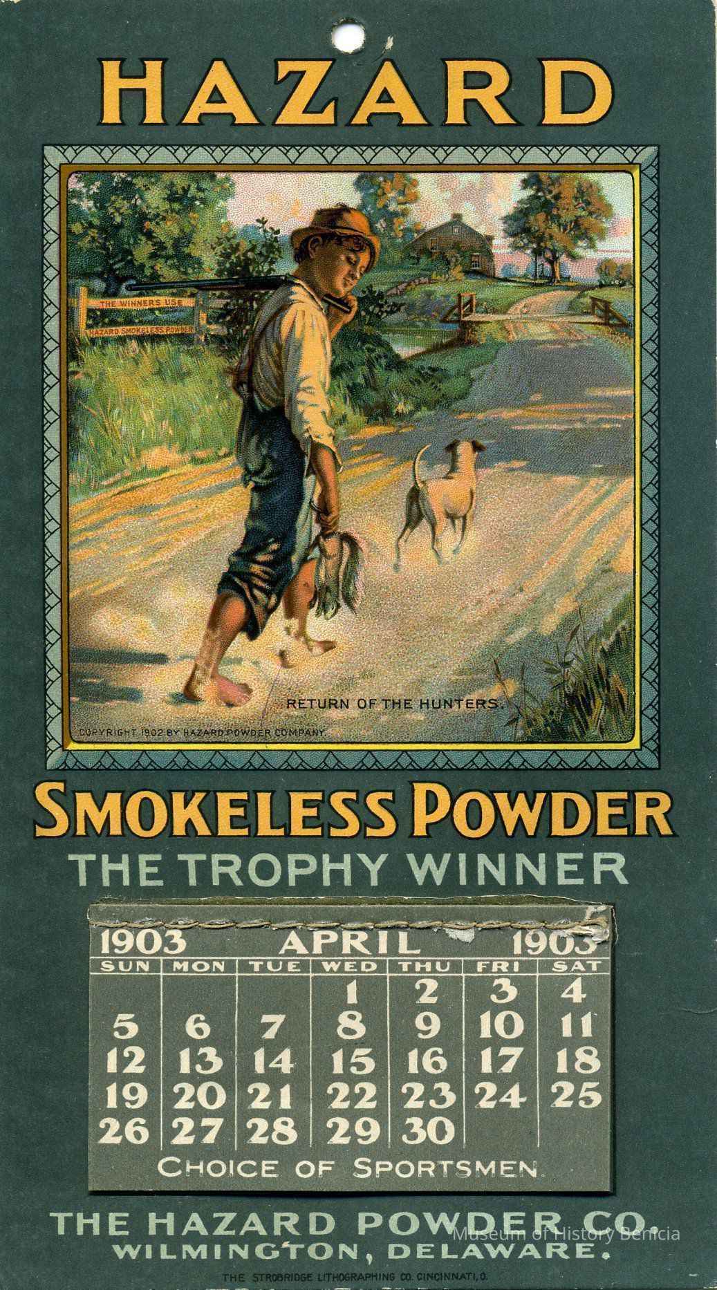 Green card with a color picture of a boy carrying a squirrel in one hand and his rifle on his shoulder, his dog walks in front "Return of the Hunters" copyright 1902 by Hazard Powder Co.