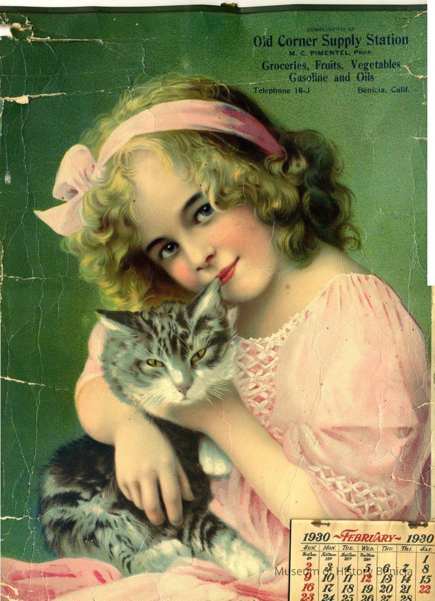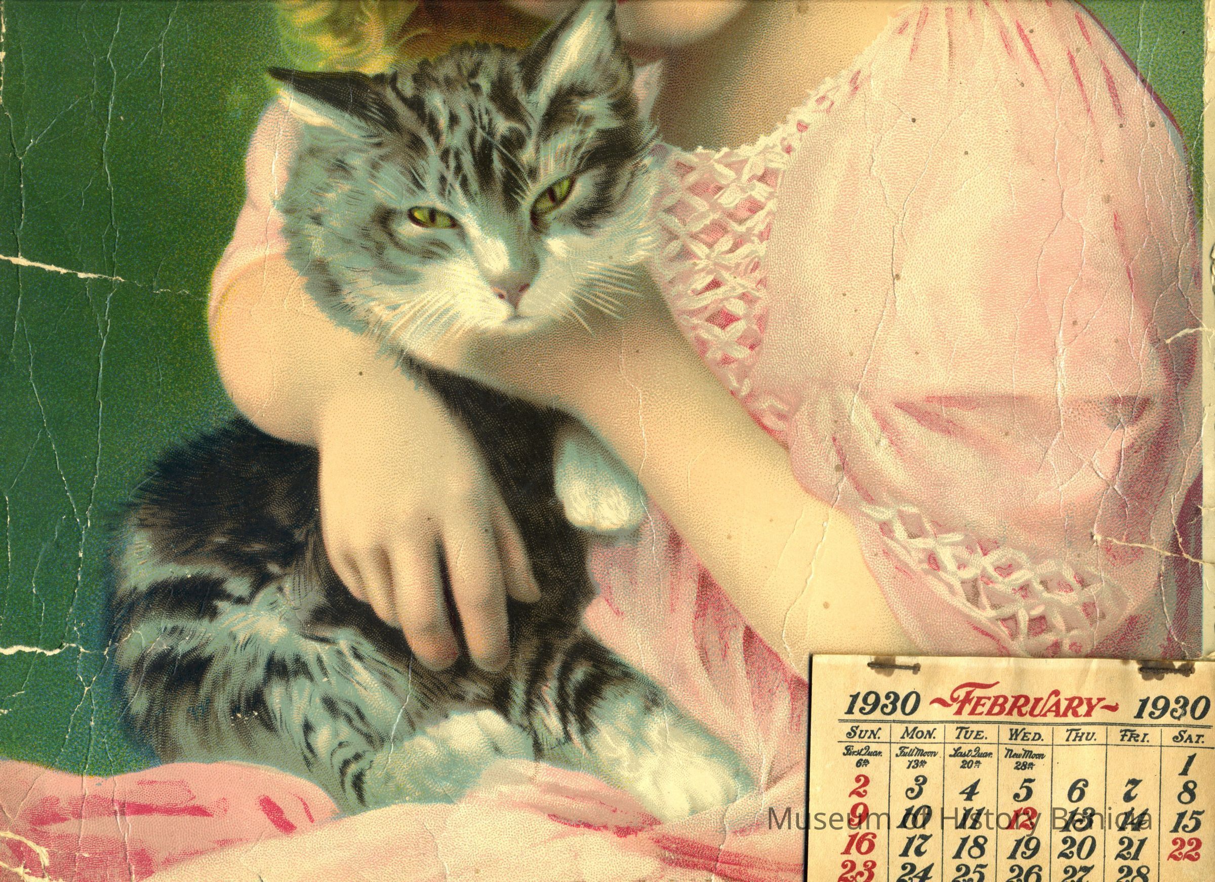 On the front is a picture of a young girl and a kitten. The calender starts with February of 1930. The wall calender is torn and the bottom has been cut off.Collection