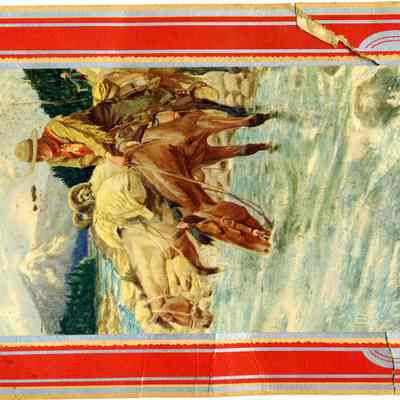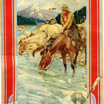 On the front is a picture of a man in buckskins on a horse with a pack horse next to him. On the pack horse are Ram'sd horns. The artist is shown as Phillip Goodwin.