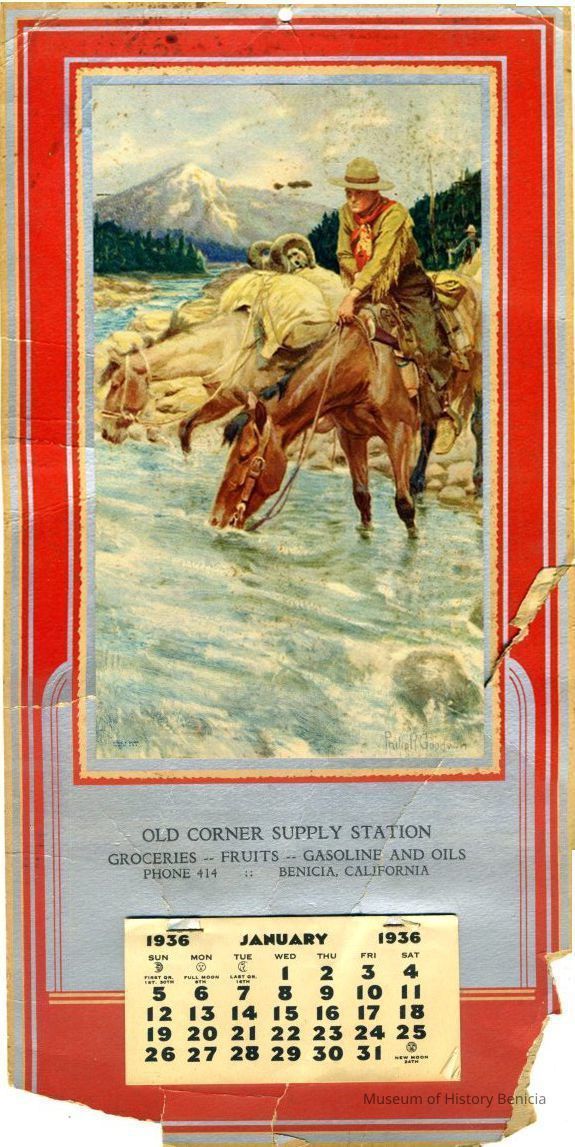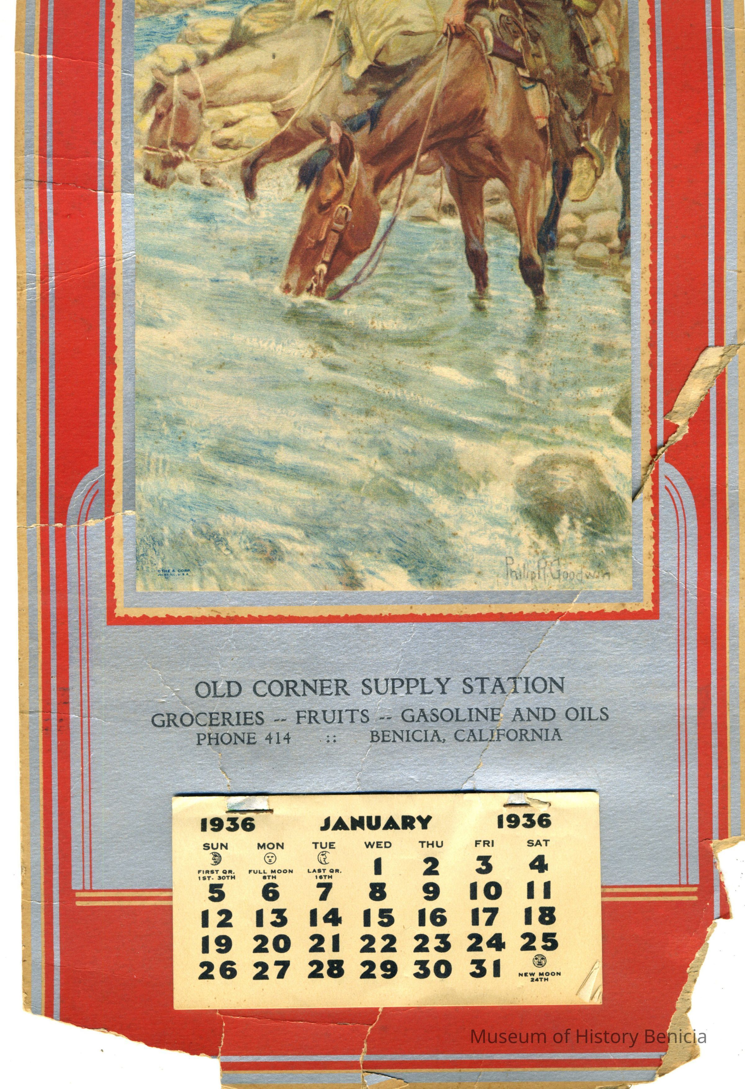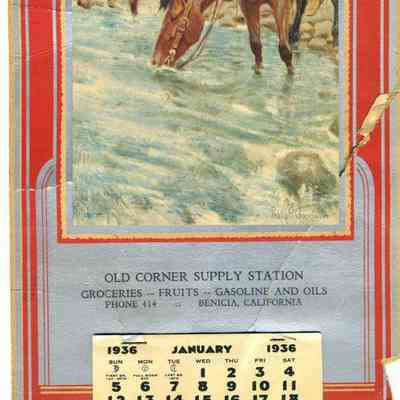 1936 Business calendar for the "Old Corner Supply Station" in Benicia. The calendar is from the Old Corner Supply Station that was located at 602 West K St. (on the corner of West 6th) in Benicia. They advertise Groceries, Fruits, Gasoline and Oils. The calender gives their phone as 414.