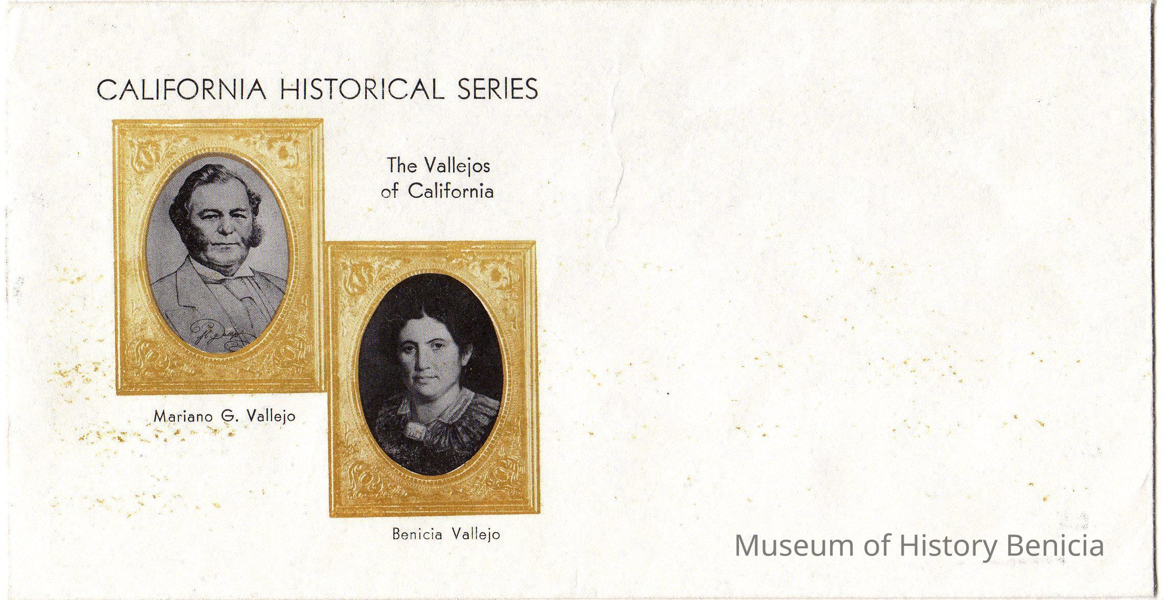 White envelope printed front left in yellow and black "CALIFORNIA HISTORICAL SERIES/ the Vallejos of California" with printed photos of MG and Benicia Vallejo. Unused.