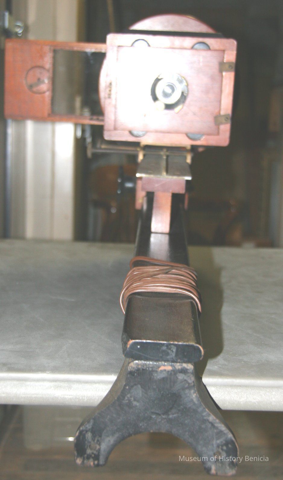 Metal stand painted black. Has cord and plug attached to it. Is currently attached to 4X5 camera (1994.30.0079) but doesn't look like it belongs.????? Inventory # 1243.Collection