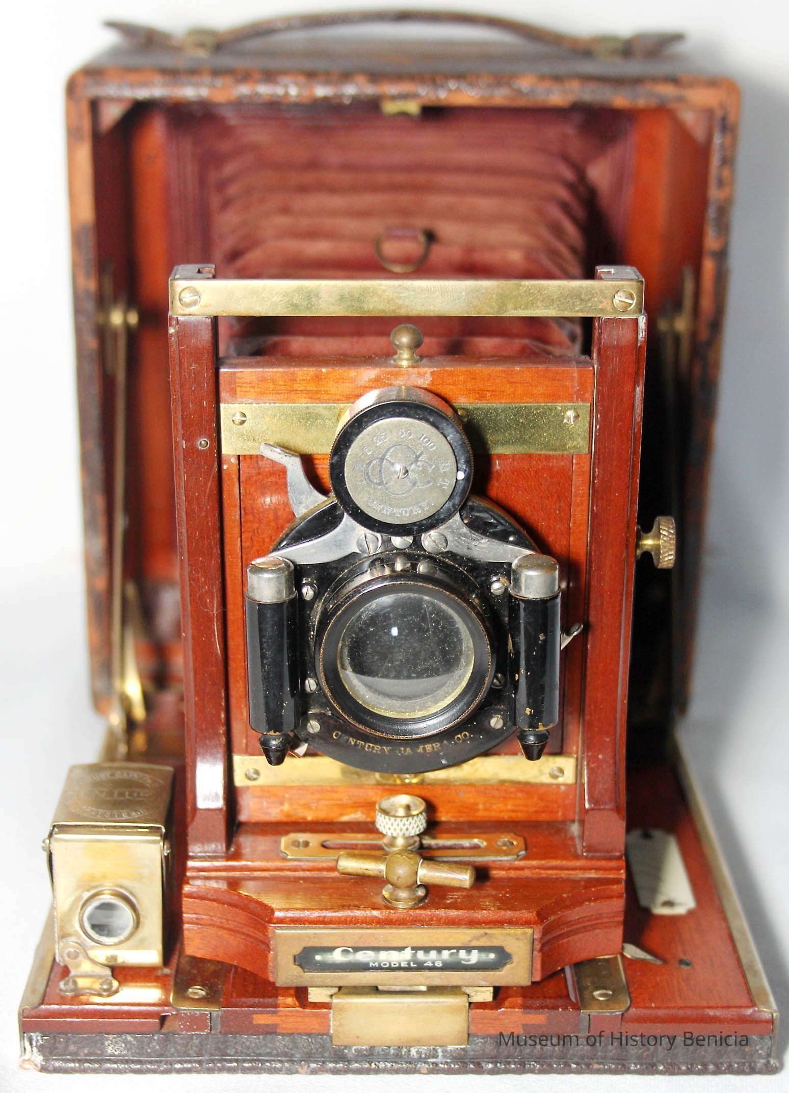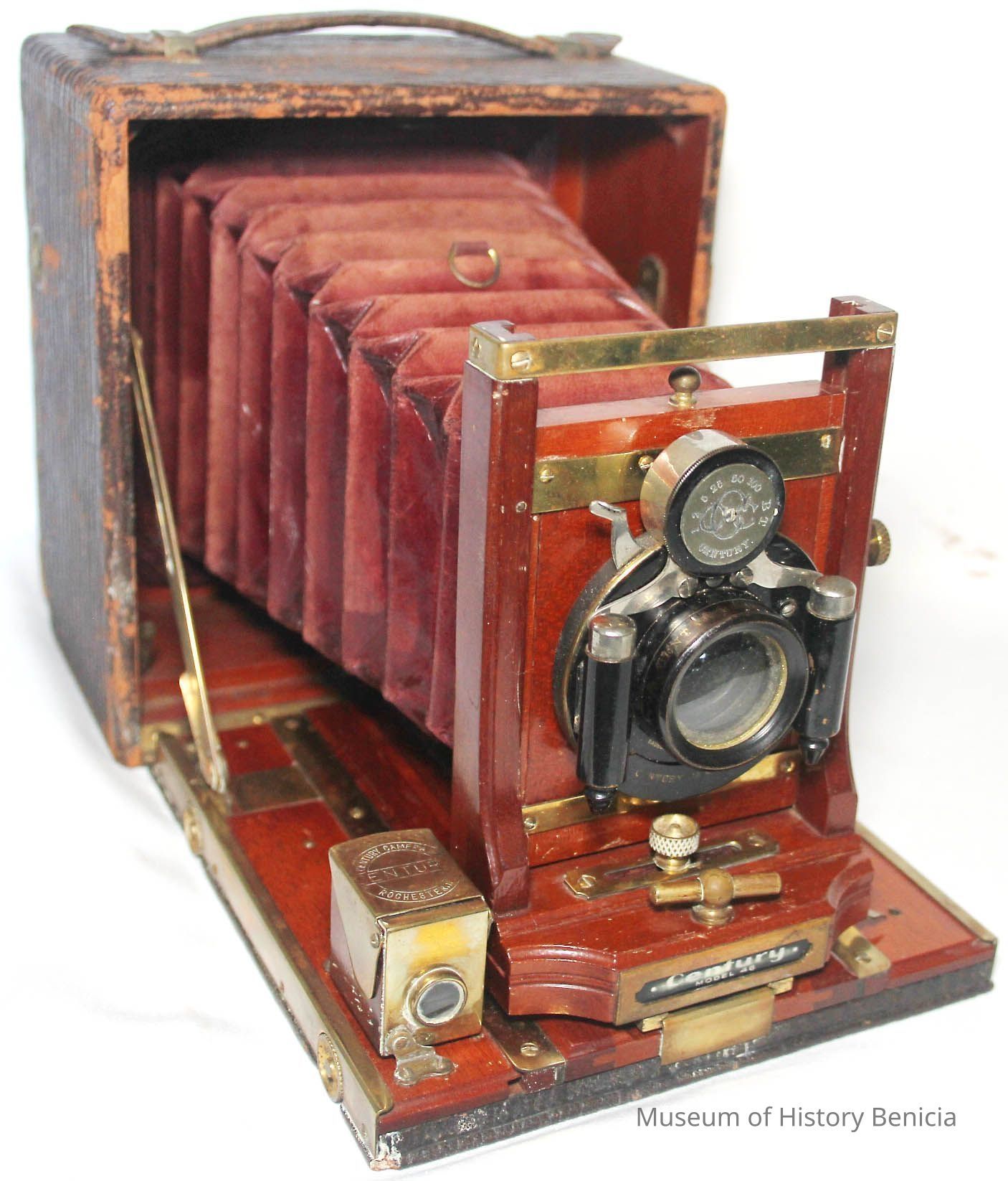 Century Model 46 folding camera. This camera was used by John Molfino a barber in Benicia early 1900s. The Museum has hundreds of his glass plate negatives some of which were probably taken with this camera.