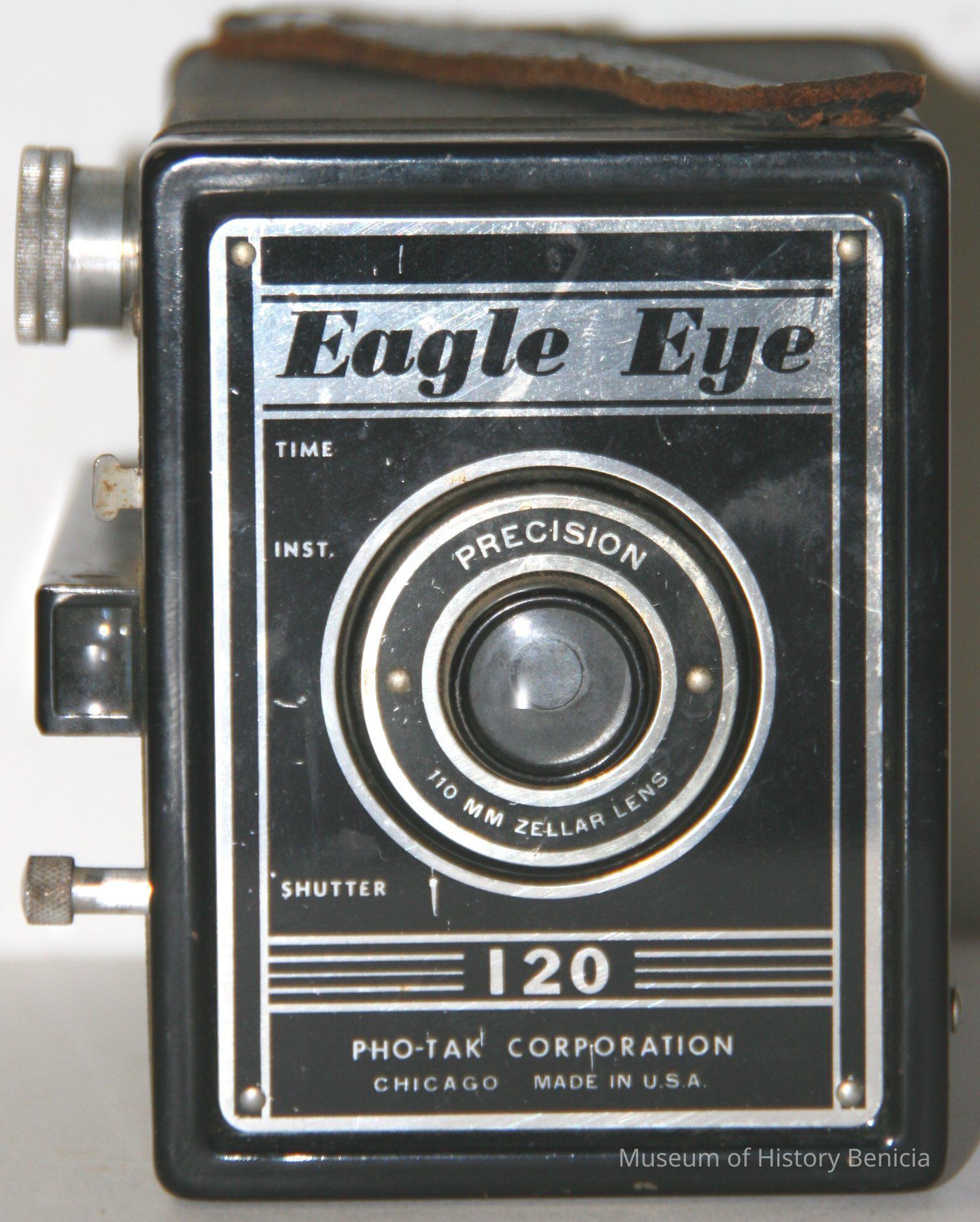 Eagle Eye 120 metal box camera with eye-level optical finder. Fixed focus box camera made by Pho-Tak corp Chicago Il. Precision 110mm lens.