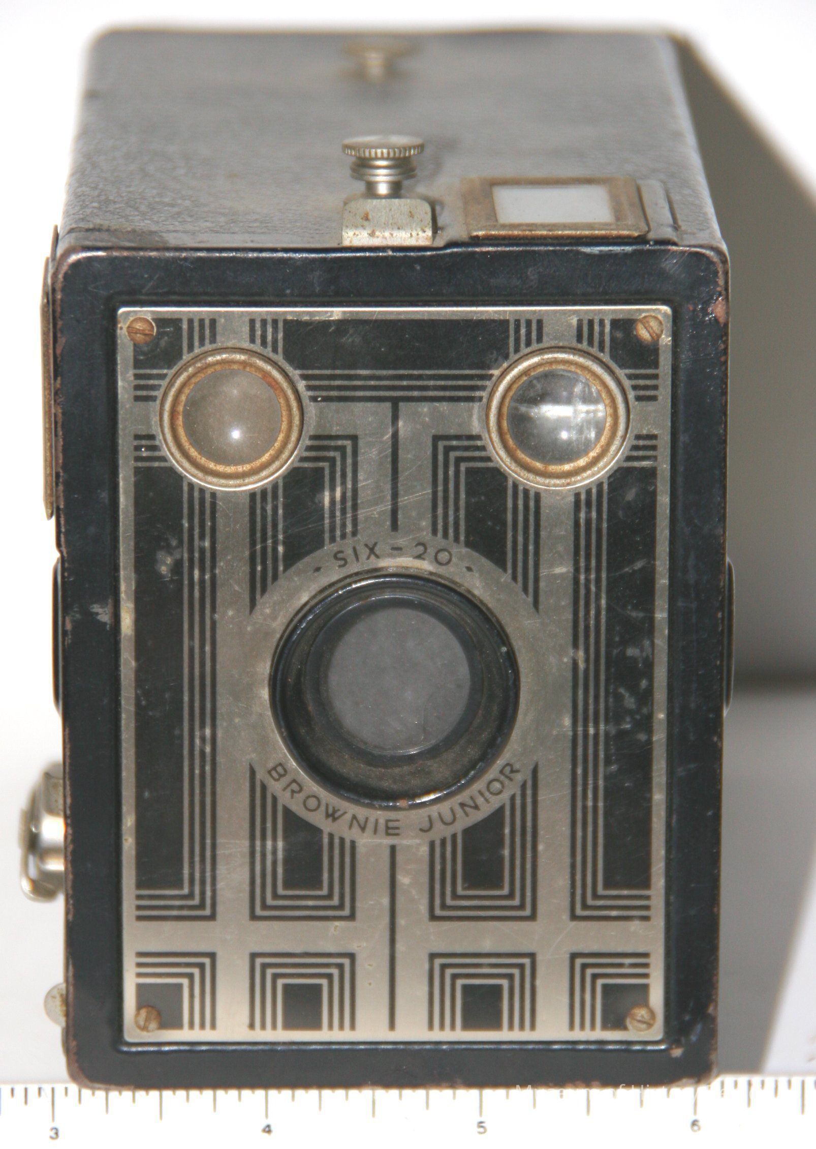 Kodak Six-20 Brownie Junior box camera with art deco front. Missing leather handle. Value in 1996 $1-$10.