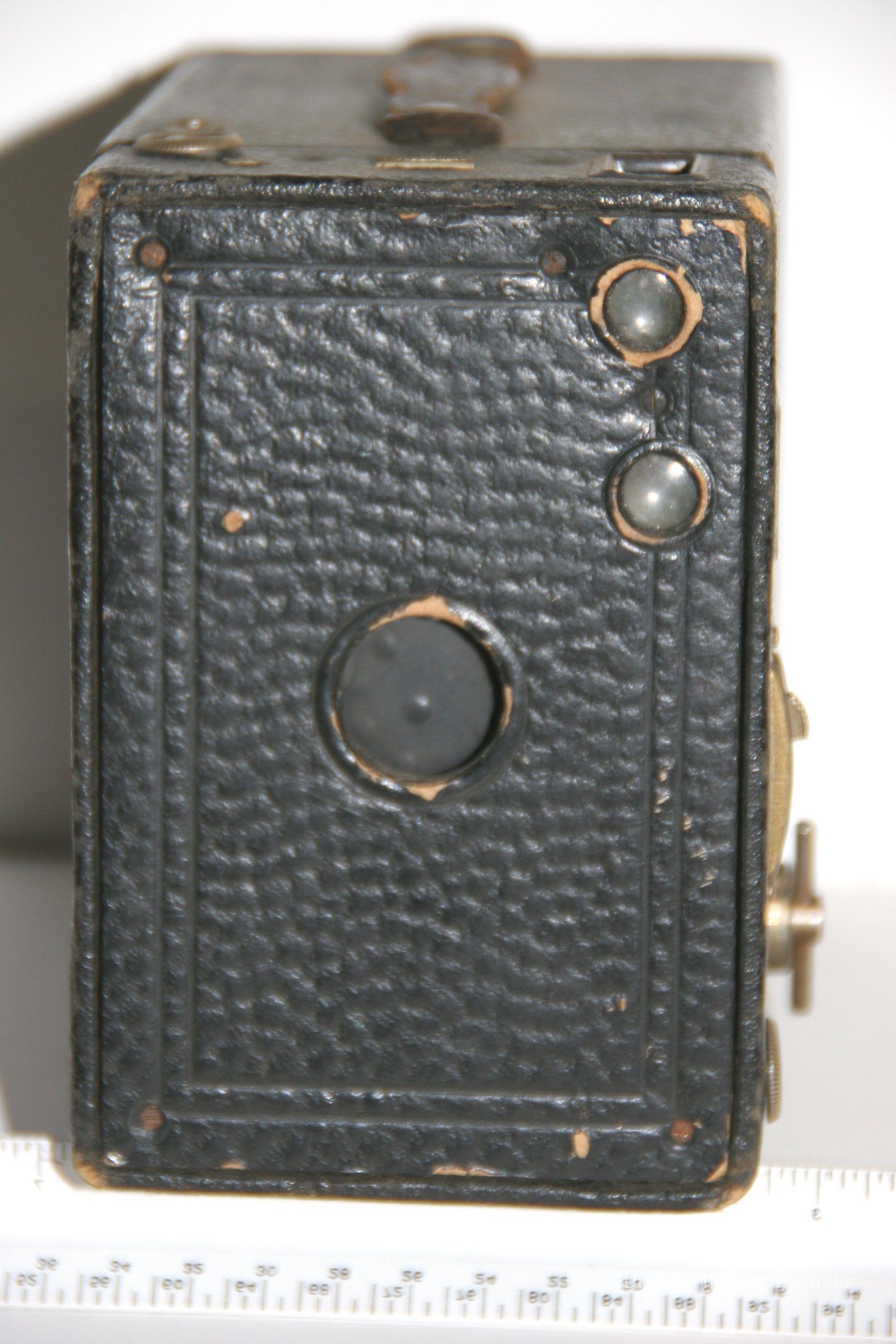 Kodak No 2A Brownie model "B" camera. Cardboard box camera for 6 exposures of 2.5 X 4.25 on 116 film. Meniscus lens and rotarty shutter. Has a grained pattern cloth cover and a cardboard body. Later models made in aluminium and came in colors but this one is black. Value in 1996 $1-$10.Collection