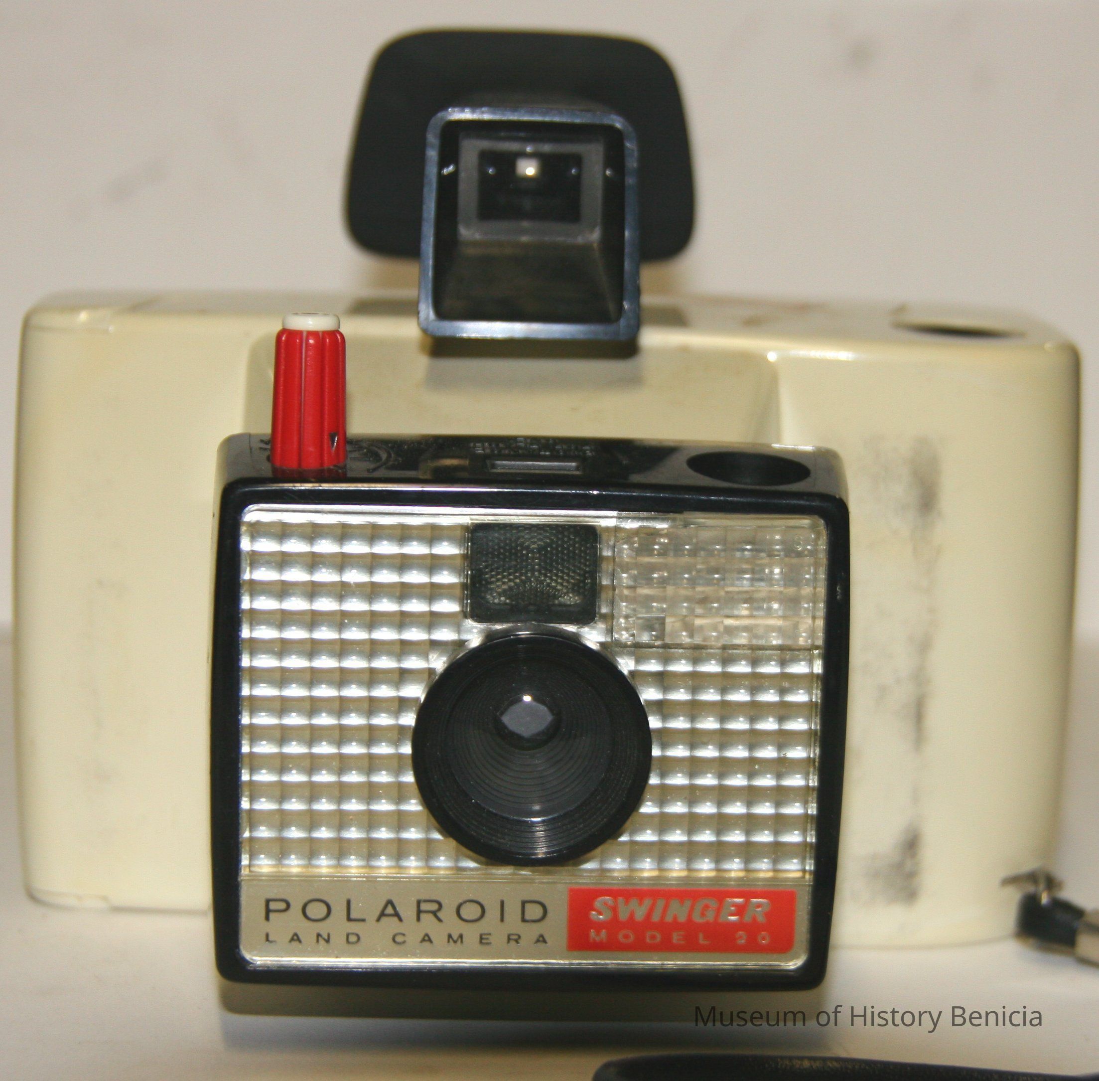 Polaroid Swinger camera model 20. White plastic camera for black & white photos on type 20 roll film, the first roll film to develop outside the camera. s/n HH7512A has "Bud Donaldson's " name on the bottom in embossed tape.Collection