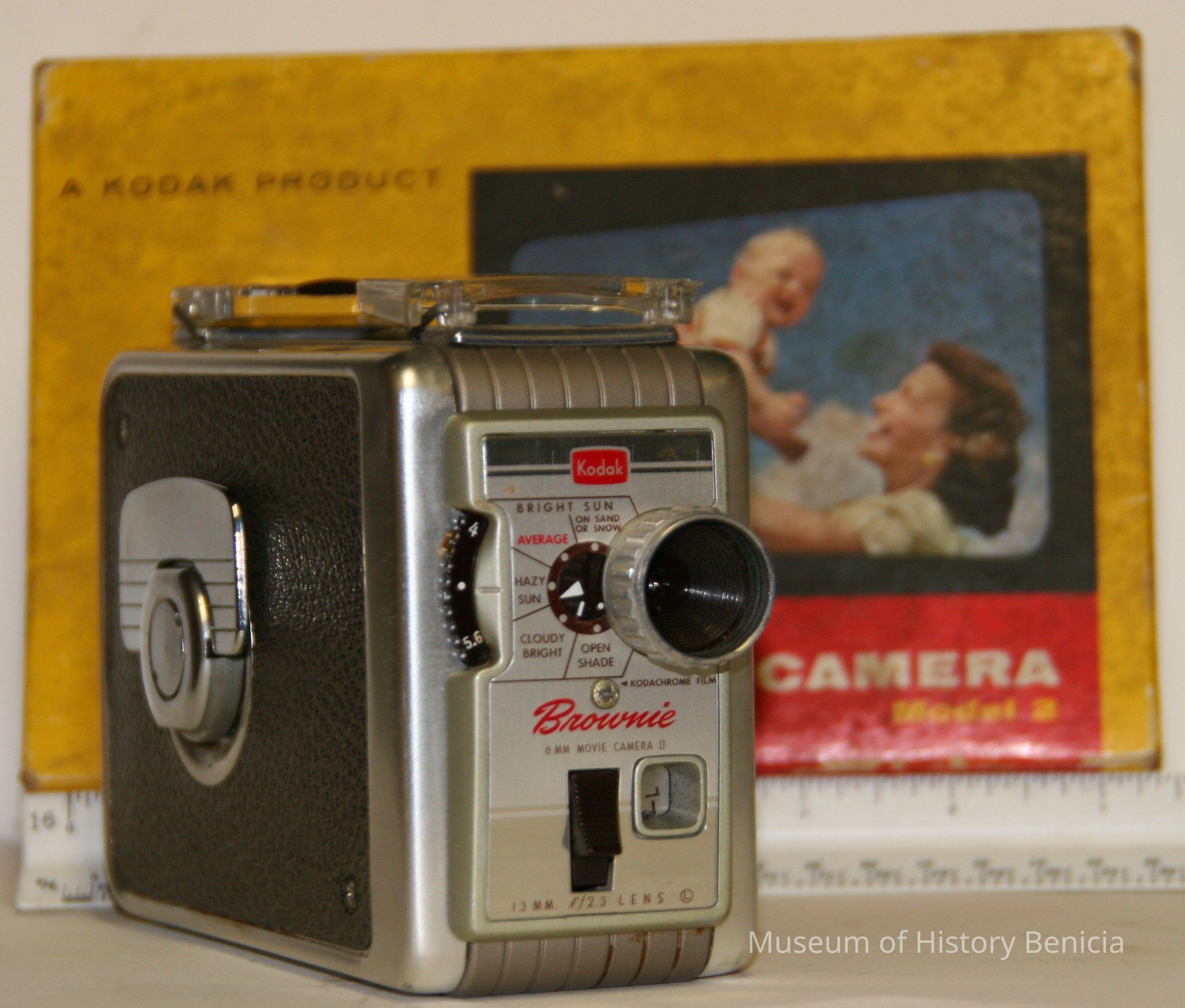 Camera, Kodak Brownie 8mm movie camera model II. Brown leatherette covered camera with box. Double-8 spool load movie camera. Single lens turret. Folding frame finders. Spring wind motors, 16 frames per second. 13mm f2.3 lens.Collection