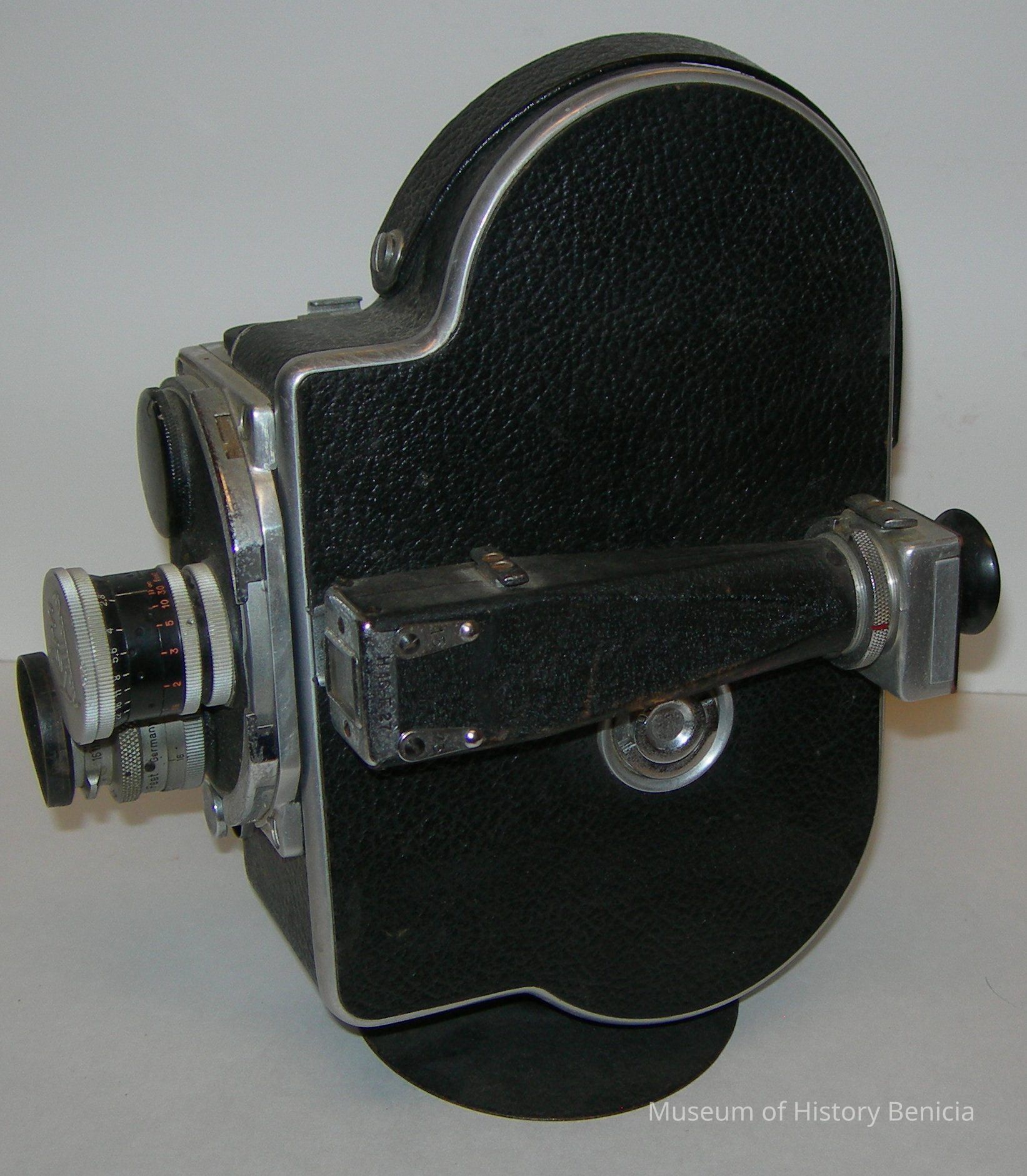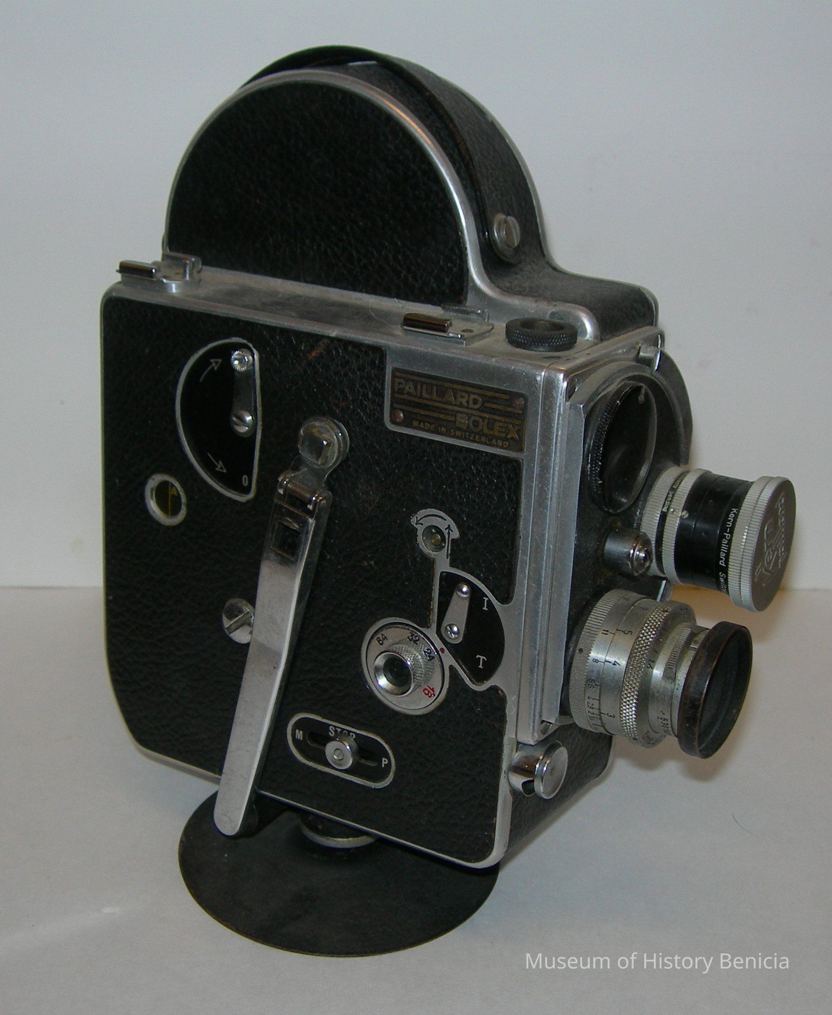 16mm Kern-Paillard/Bolex Movie Camera with attached short stand; black with chrome trim; leather carrying/holding handle; wind-up handle on one side