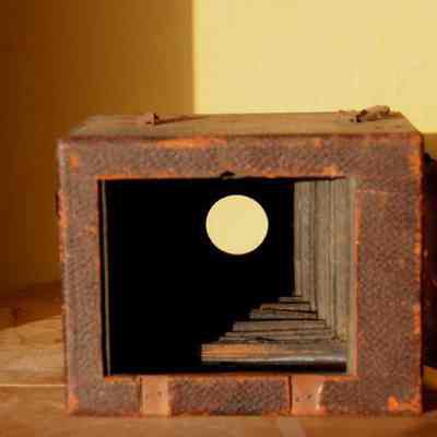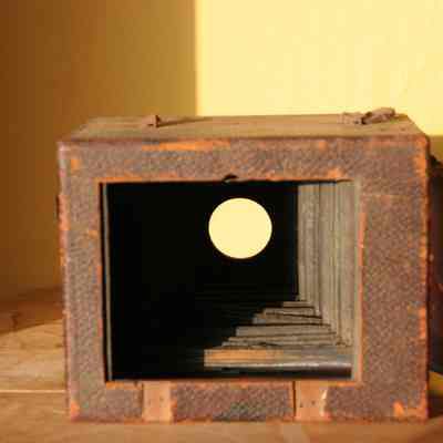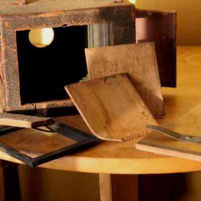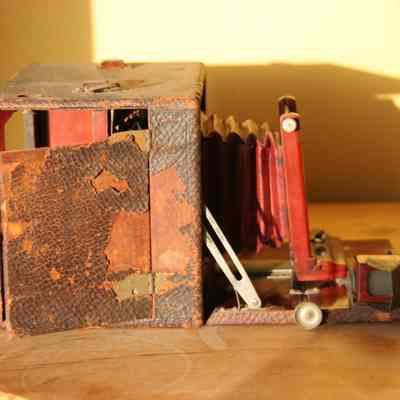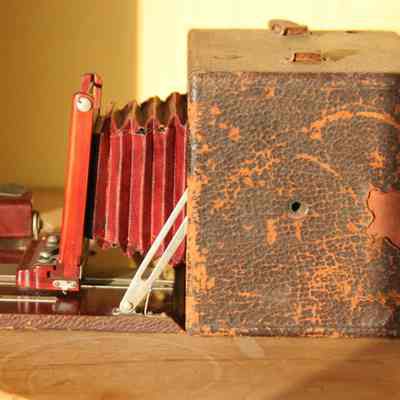 Kodak No 4 Folding Kodet Camera. 1894-1897. Folding bed camera for 4 x 5 plates or special roll holder. Cube shaped when closed. Early model has vertical shape. This is a later model with horizontal body. Had a Gundlach Optical Co external shutter and probably lens too. The lens is missing. Also, the back is missing as well as a part of the door on the side.