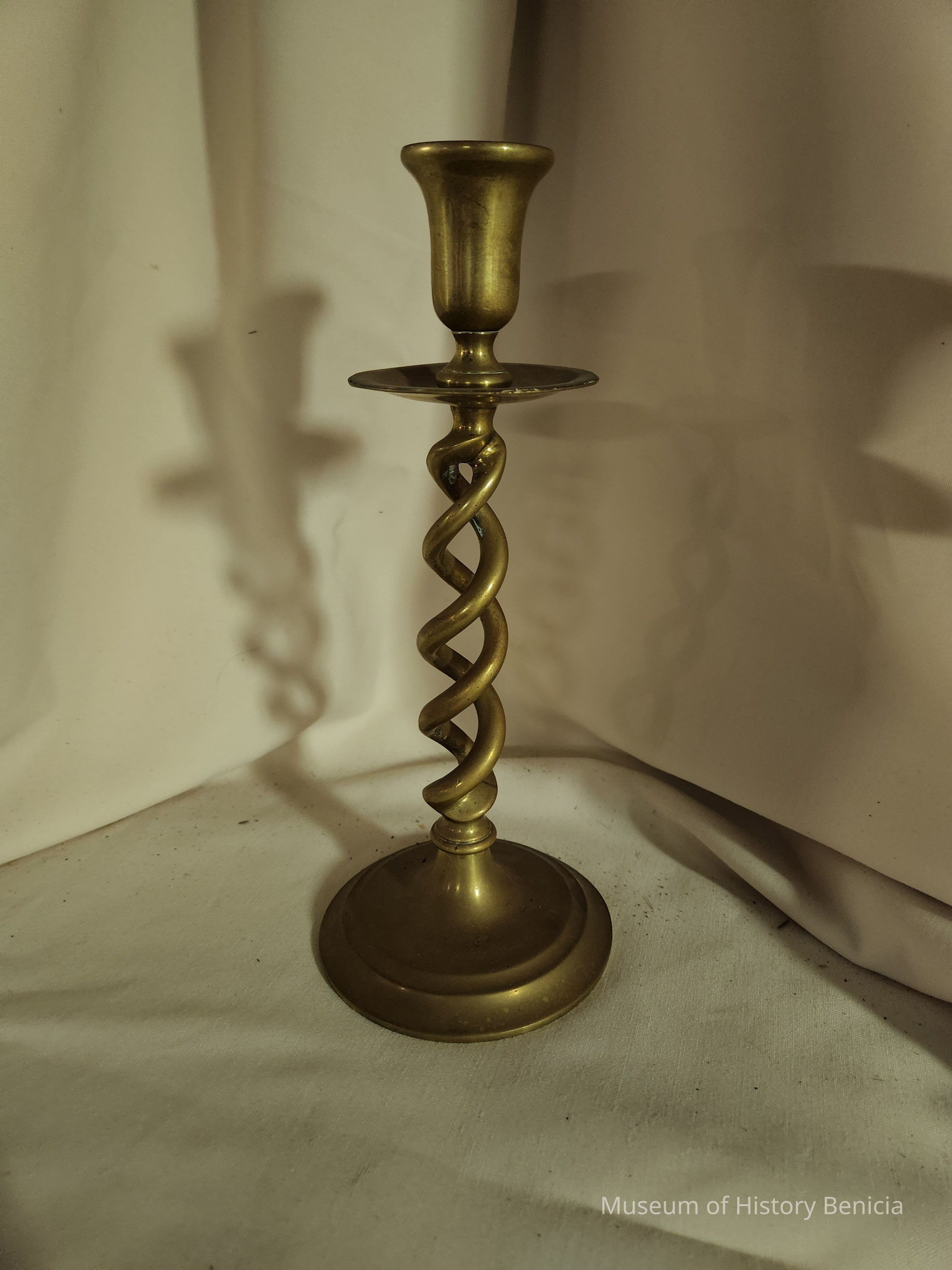 Brass candlestick; has a twisted middle with various grooves on base and near top