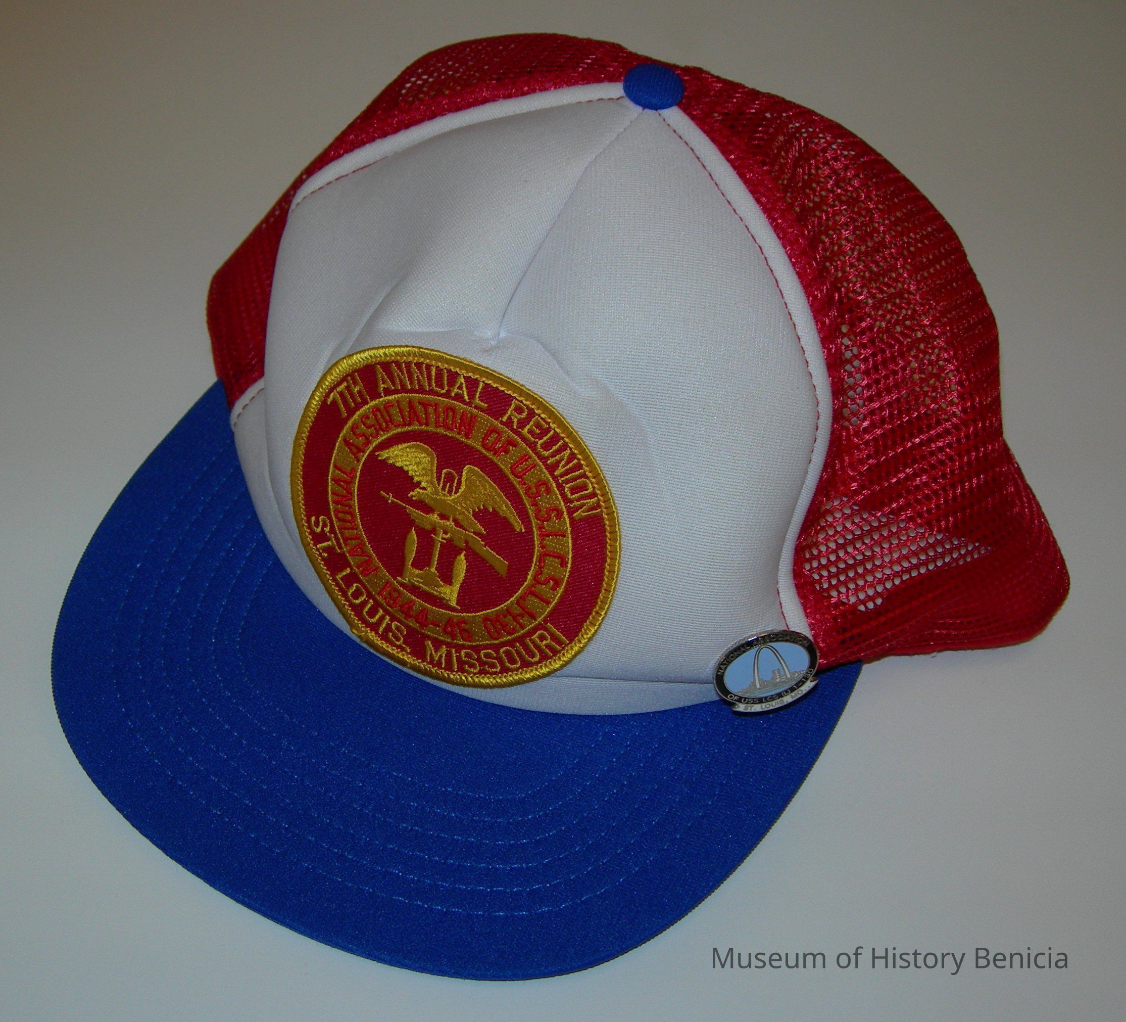 Baseball style cap with mesh and adjustable closure on back; "Reunions of the National Assn of US-S/LCS (L) 1-130 1944-46 7th Annual Reunion, St. Louis Missouri" embroidered on a red and gold emblem on the front of the cap; red and white with blue bill
