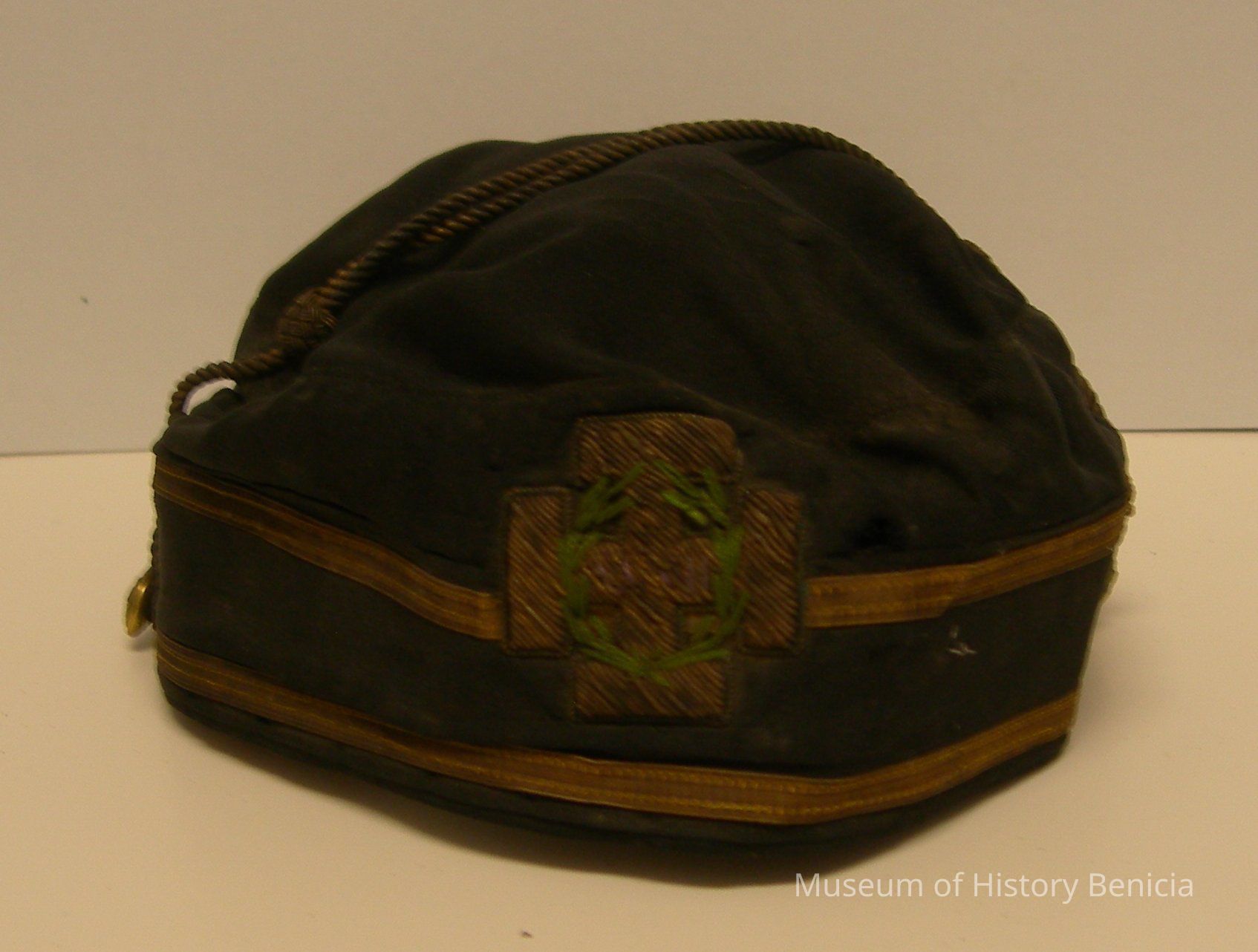 Skull Cap style - black with two gold ribbon bands all around; button on each side and cord goes from button to button over the top; there is a crossed capital I's embroidered badge on the front; leather band inside; inside label in silver ink: "Military - Naval - Society Goods, Uniforms & Caps / B. Pasquale Co. / 115-117 Post St. San Francisco"; size 7