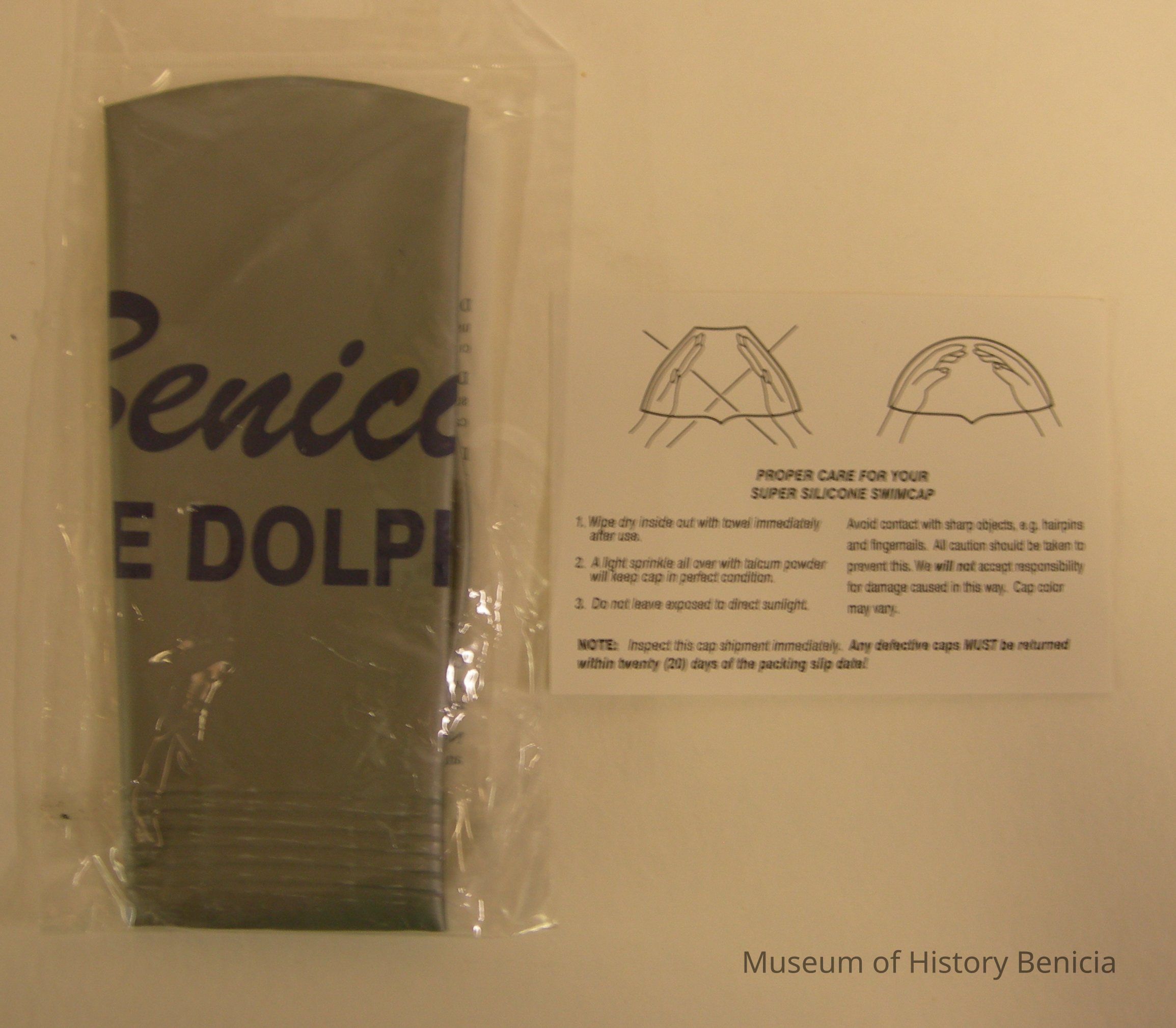 Team swimming cap - silver silicone fabric with "Benicia Blue Dolphins" printed on in blue ink.
