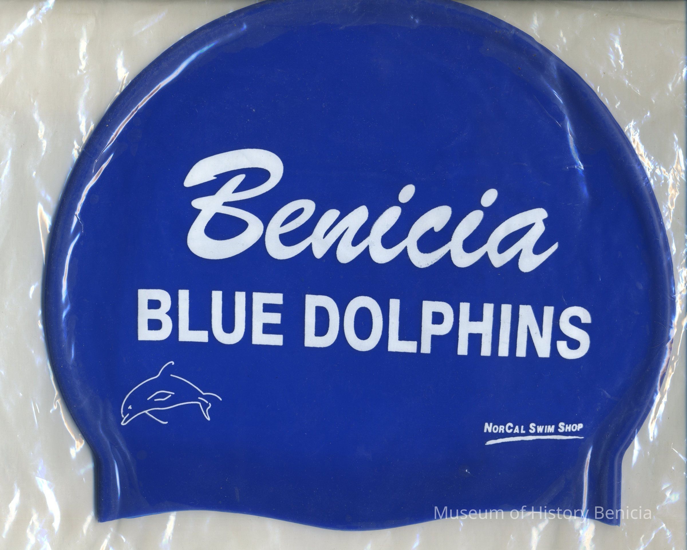 Swim/bathing cap, royal blue with white lettering "Benicia / Blue Dolphins" and a drawing of a leaping dolphin (also in white), "NorCal Swim Shop" is in white near the lower edge;