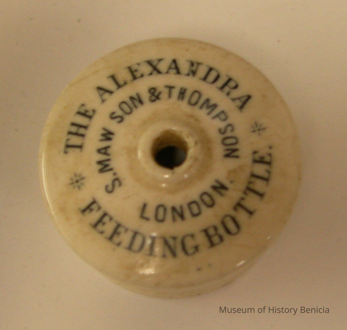 Slide on ceramic bottle cap - "The Alexandra Feeding Bottle" "S. Maw Son & Thompson London", has a hole in top middle; use is unknown; 1-5/8" diameter x 3/4" tall