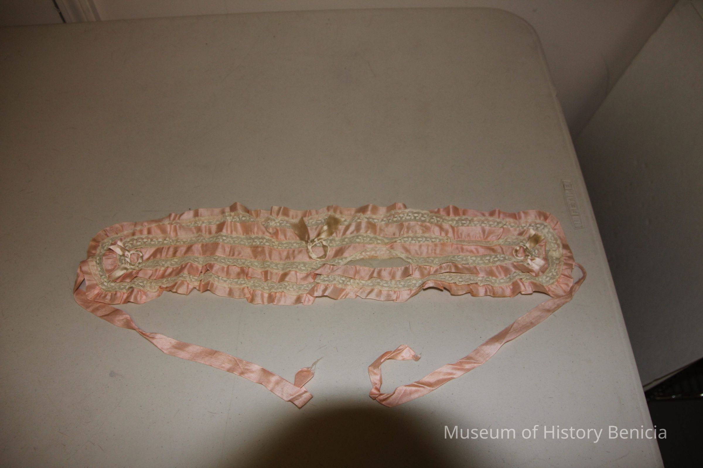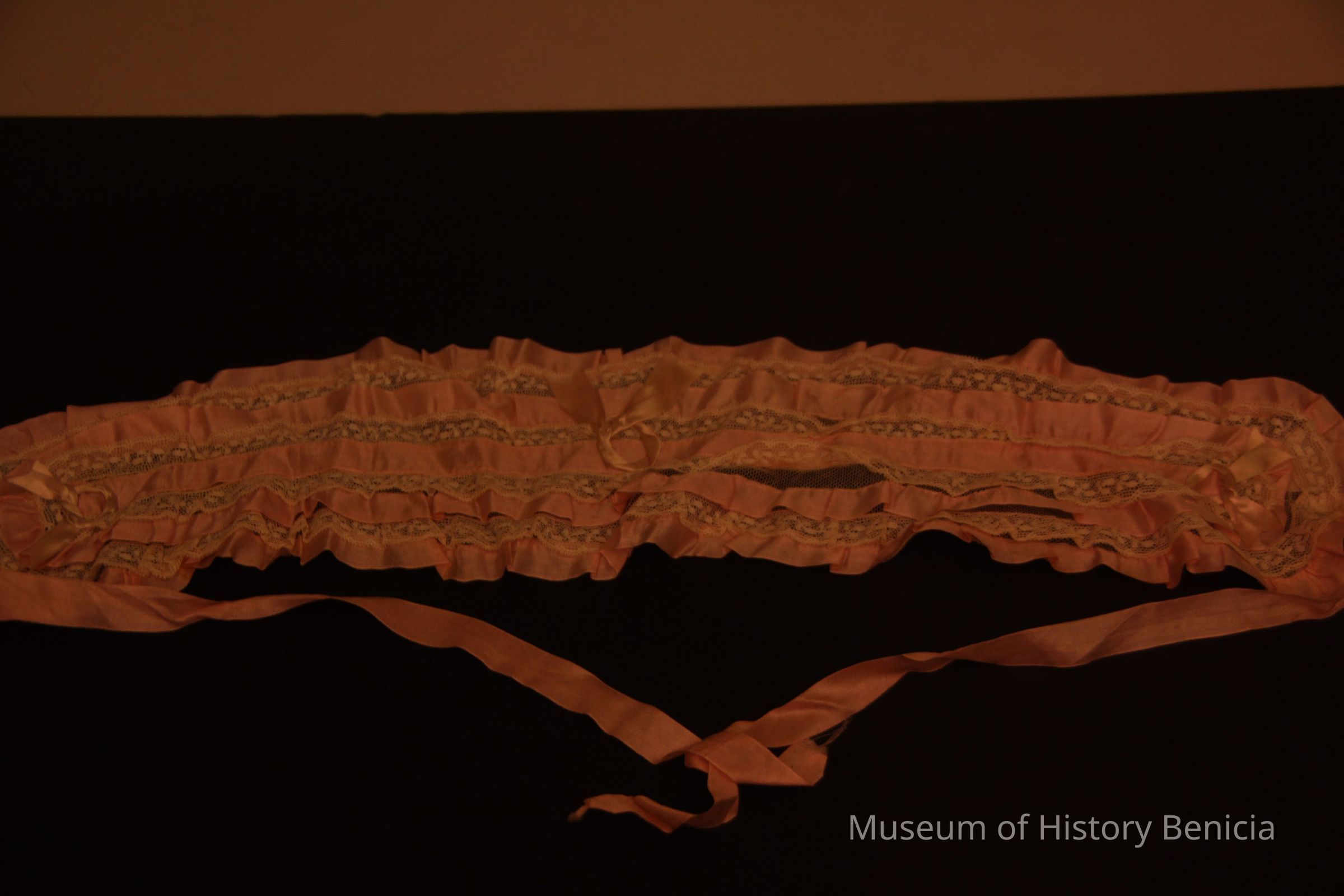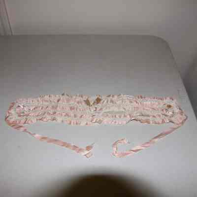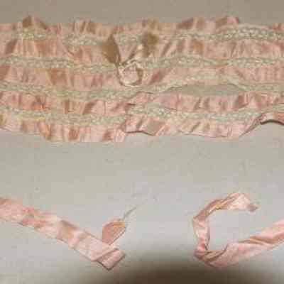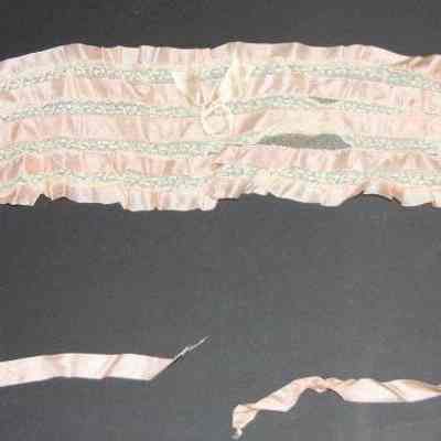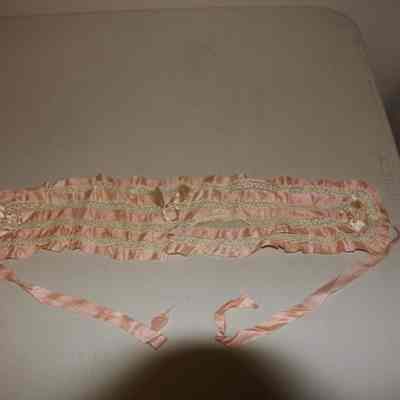Peach silk ribbon and fine cotton lace sewn side-by-side for the base with double sided pink/blue ribbon design for each side and at the center. Peach silk ribbon for tie.