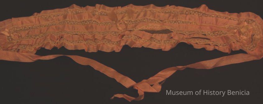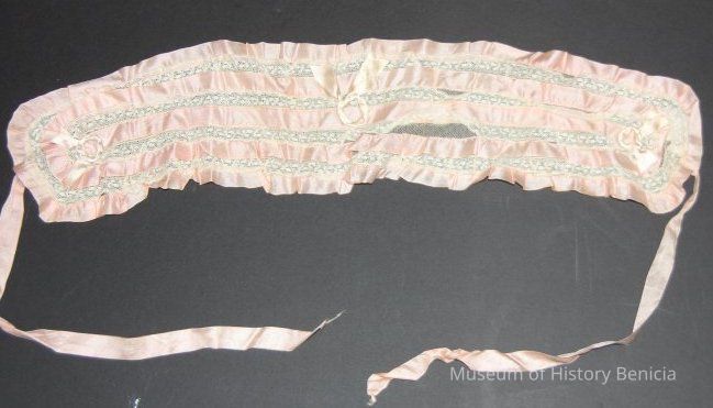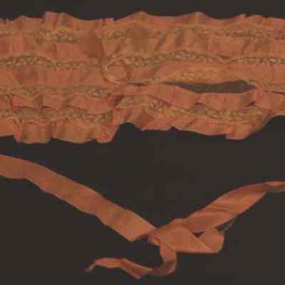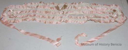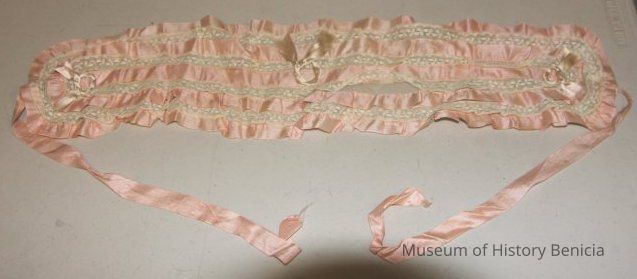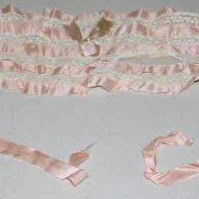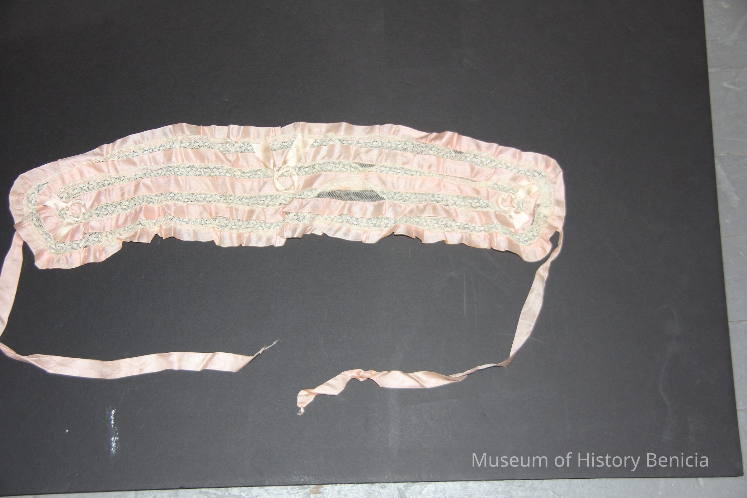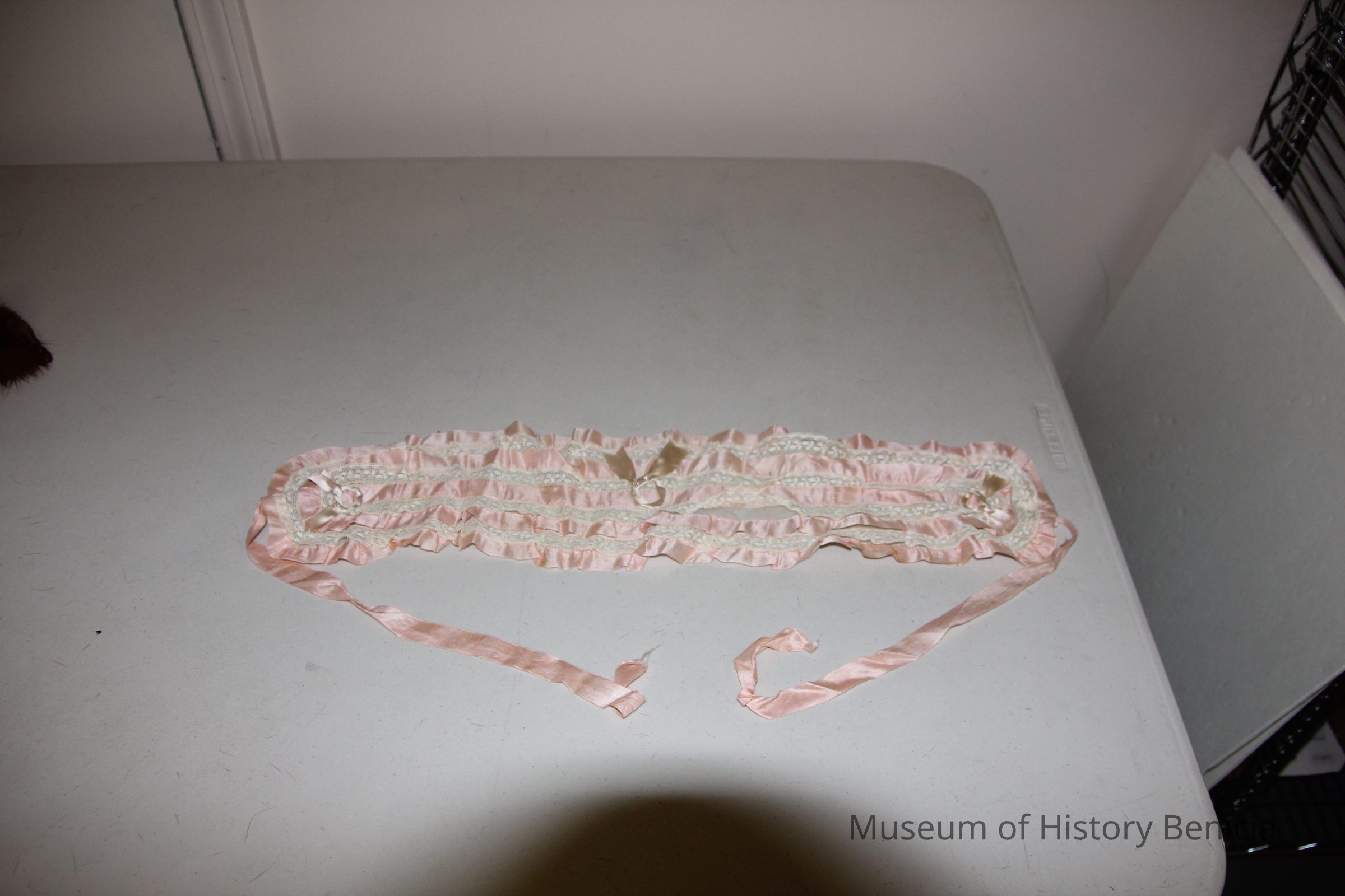 Peach silk ribbon and fine cotton lace sewn side-by-side for the base with double sided pink/blue ribbon design for each side and at the center. Peach silk ribbon for tie.