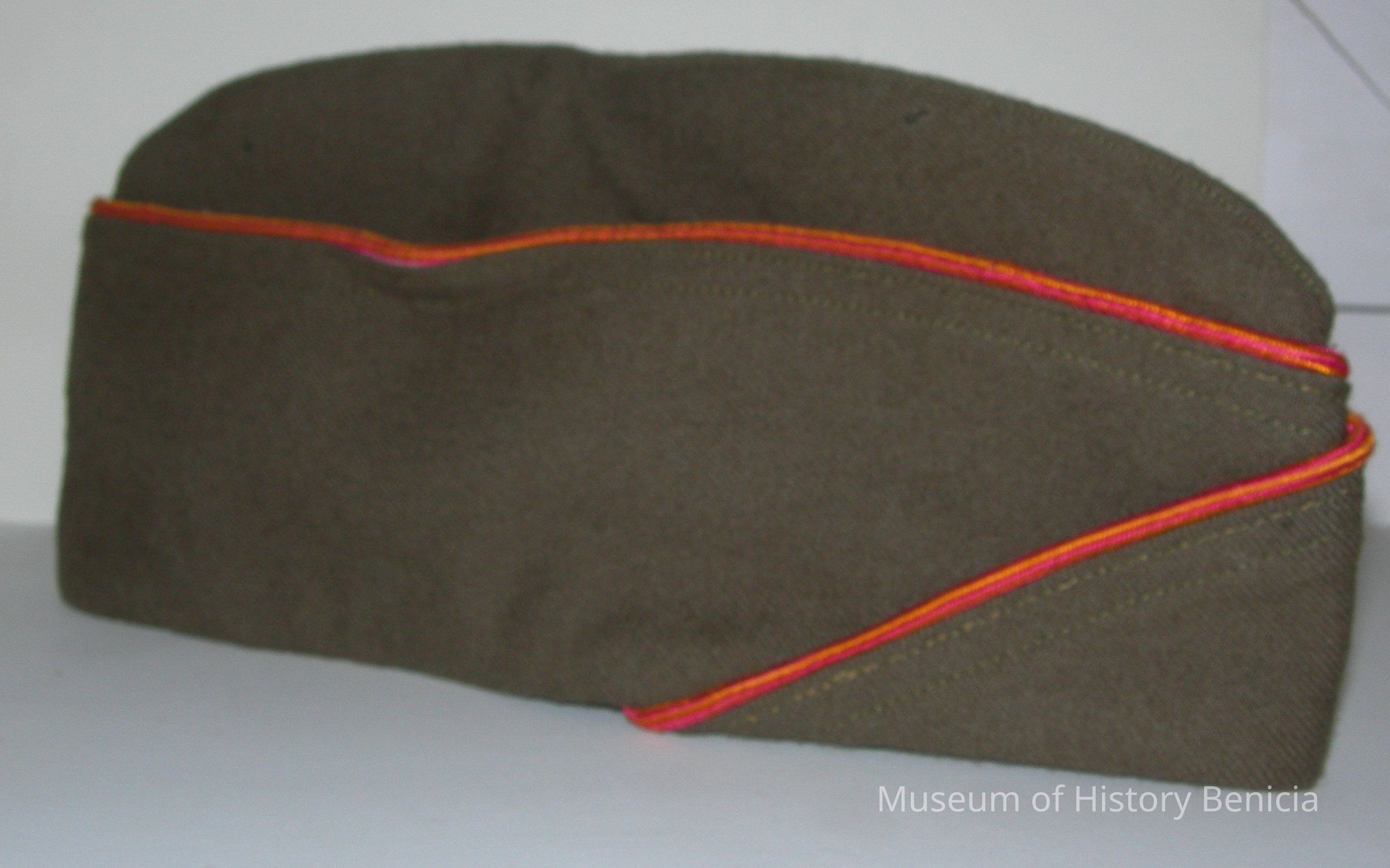 WWII US Army Garrison Cap worn by a Techical Staff Sergeant in the Ordnance Department. Khaki color with reddish piping. Label inside reads: "Caps, Garrison, O.D. / Size 7 / Midwest Cap & Garment Co. / P.O. No 17992 / Dated March 21, 1945 / Sep No. 8-114-B Type 1 / Dated June 2, 1942 / Stock No 73-C-18130 / Phila. Q. M. Depot".
