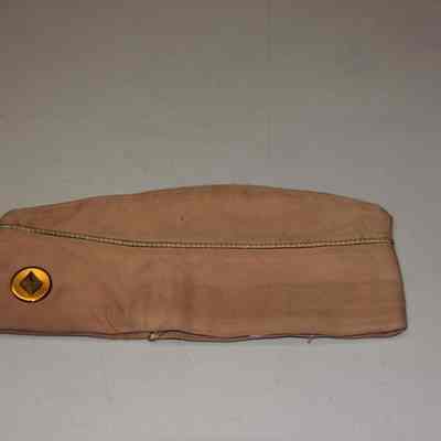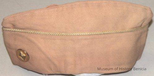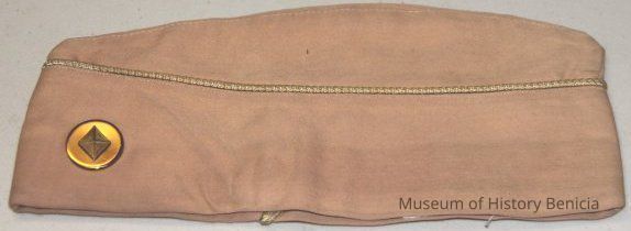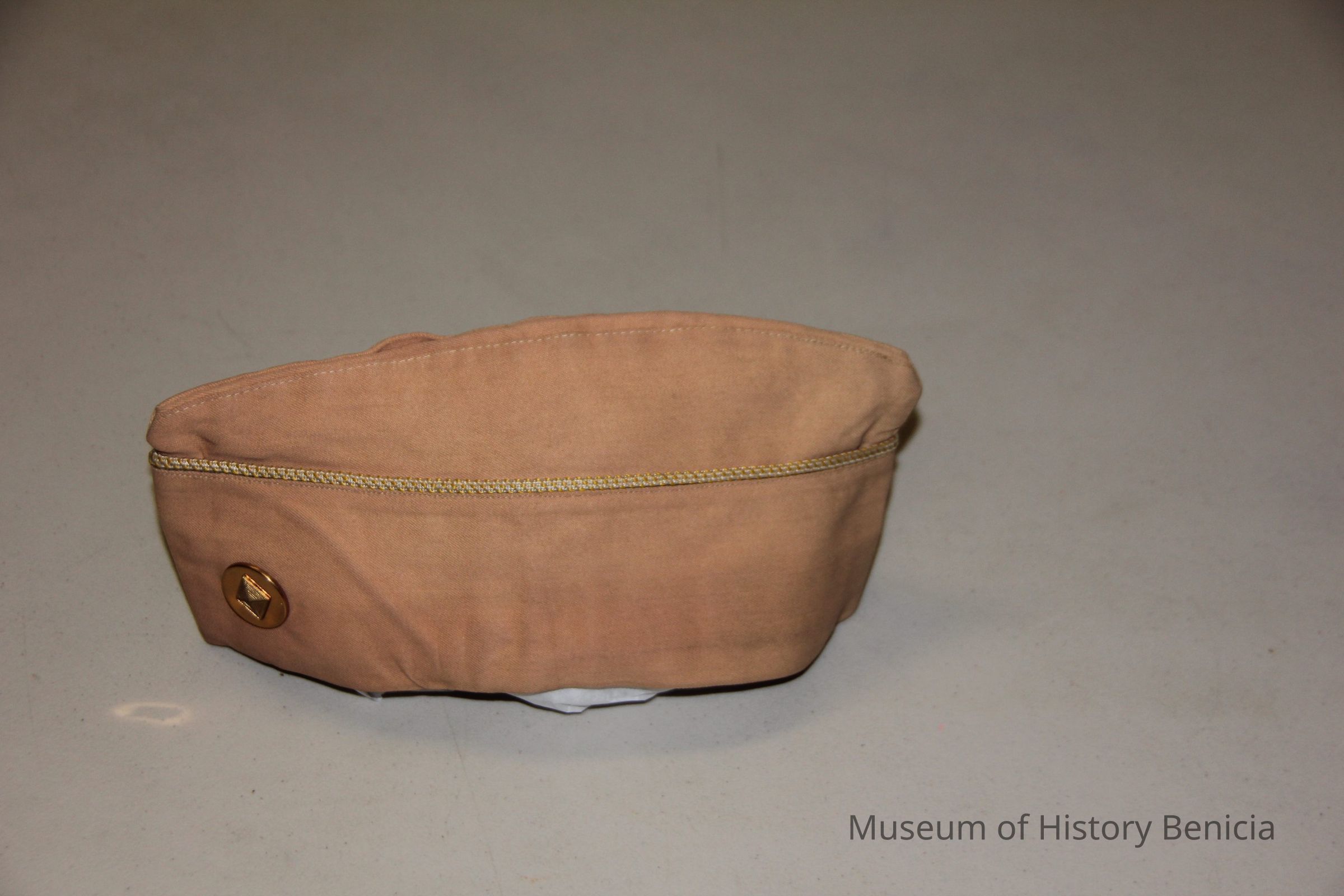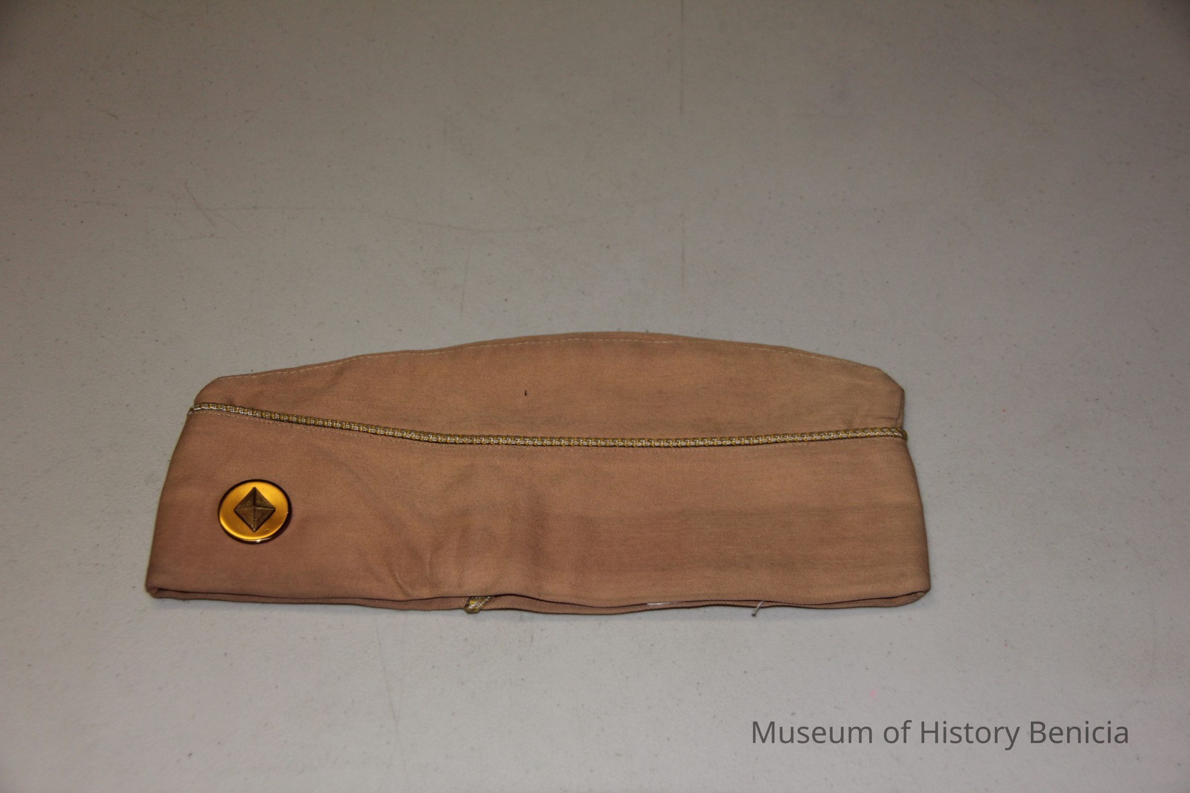 Hat of World War II uniform. Belonged to Max V Egger who served in the S. Pacific. Has emblems showing he was a staff sgt. in the Signal Corps. Service # 39 692 166. Hat is brown.