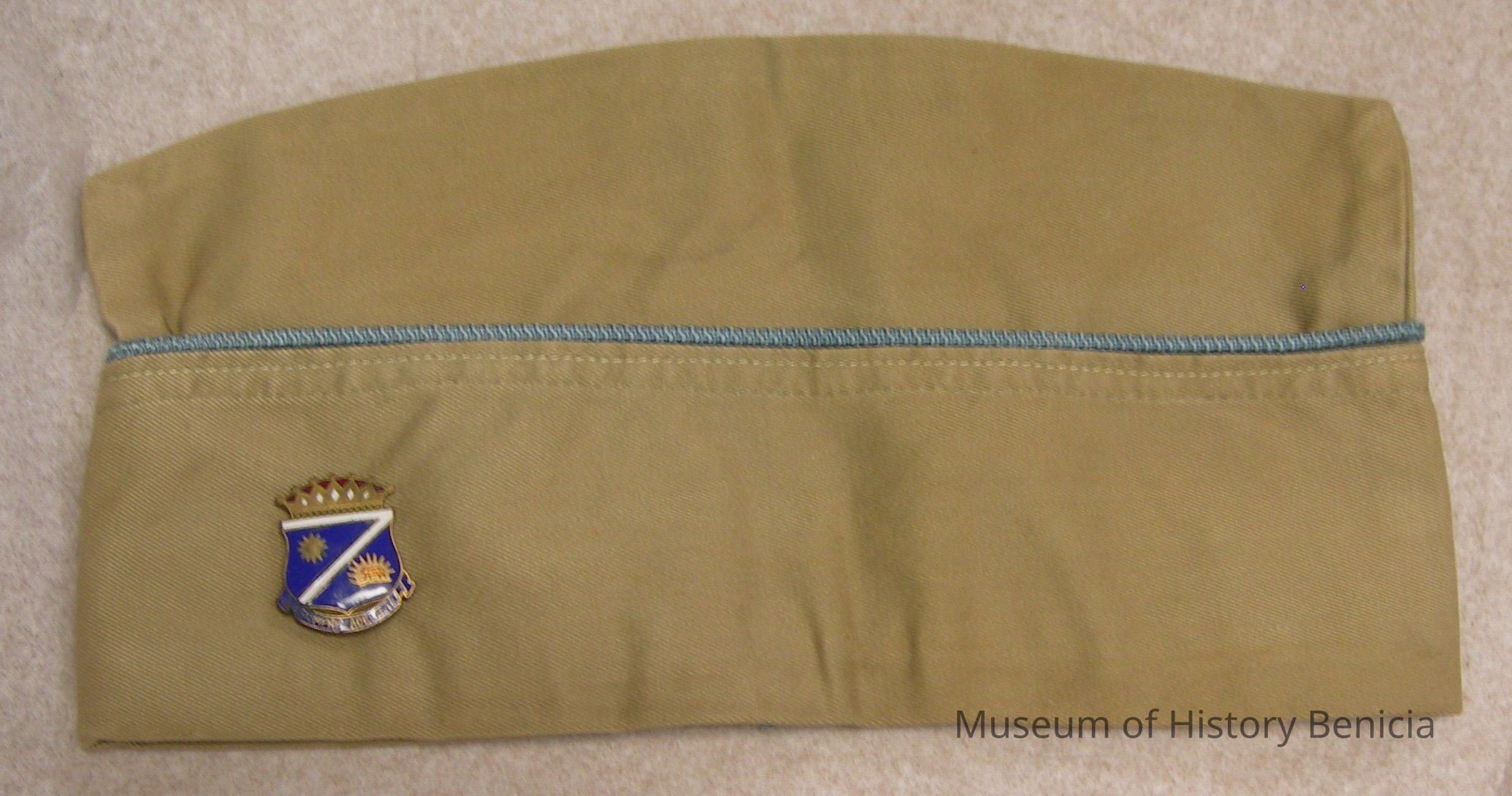 Korean War Garrison Cap, brown with blue piping; 10-3/4"long