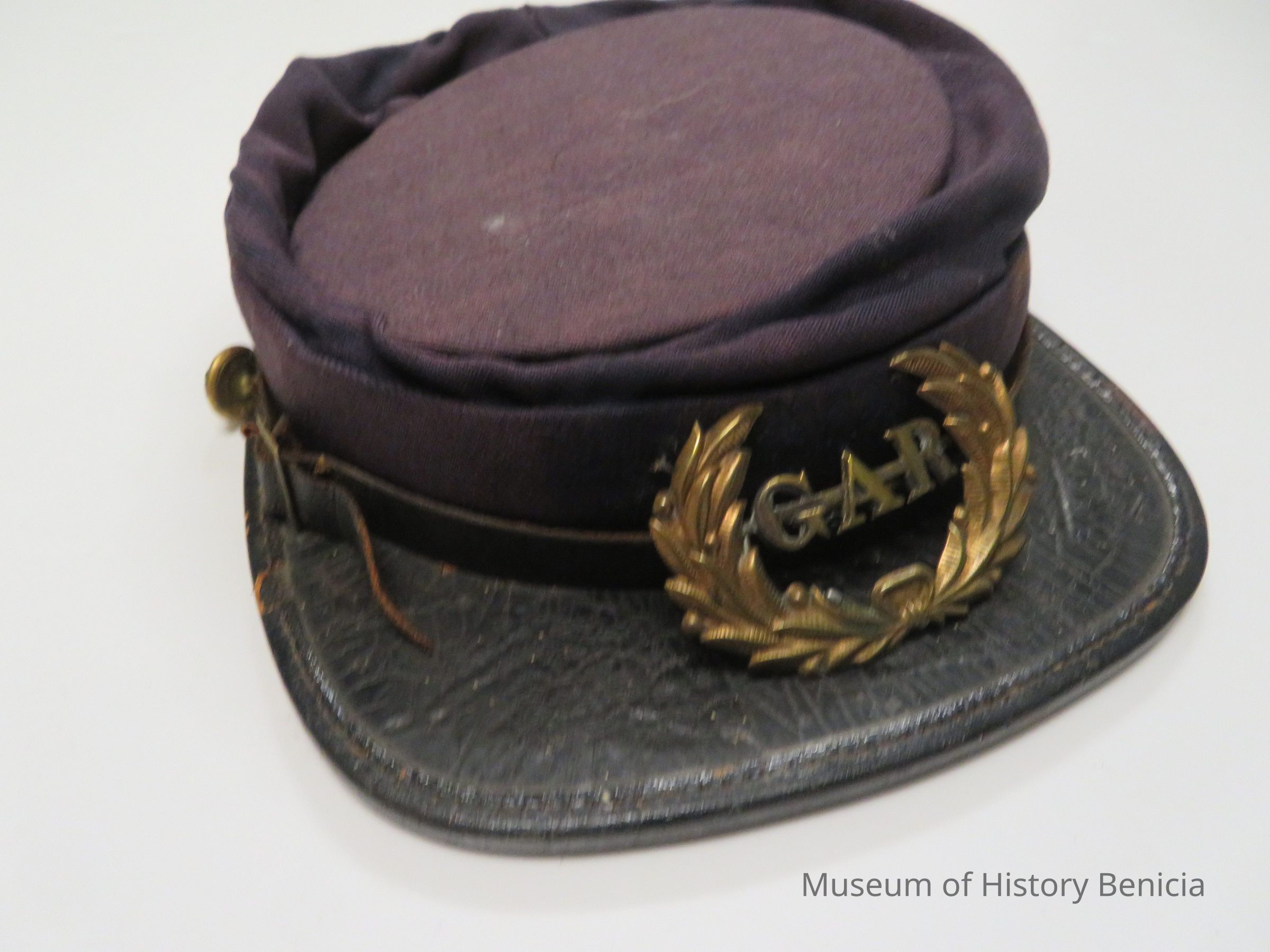 It is made of blue material with the GAR emblem on front of cap and gold metal buttons. It measures 4 3/4" in height, length of 10 1/2" in length and 6 1/2" in width. There is leather in the cap's bill.Collection