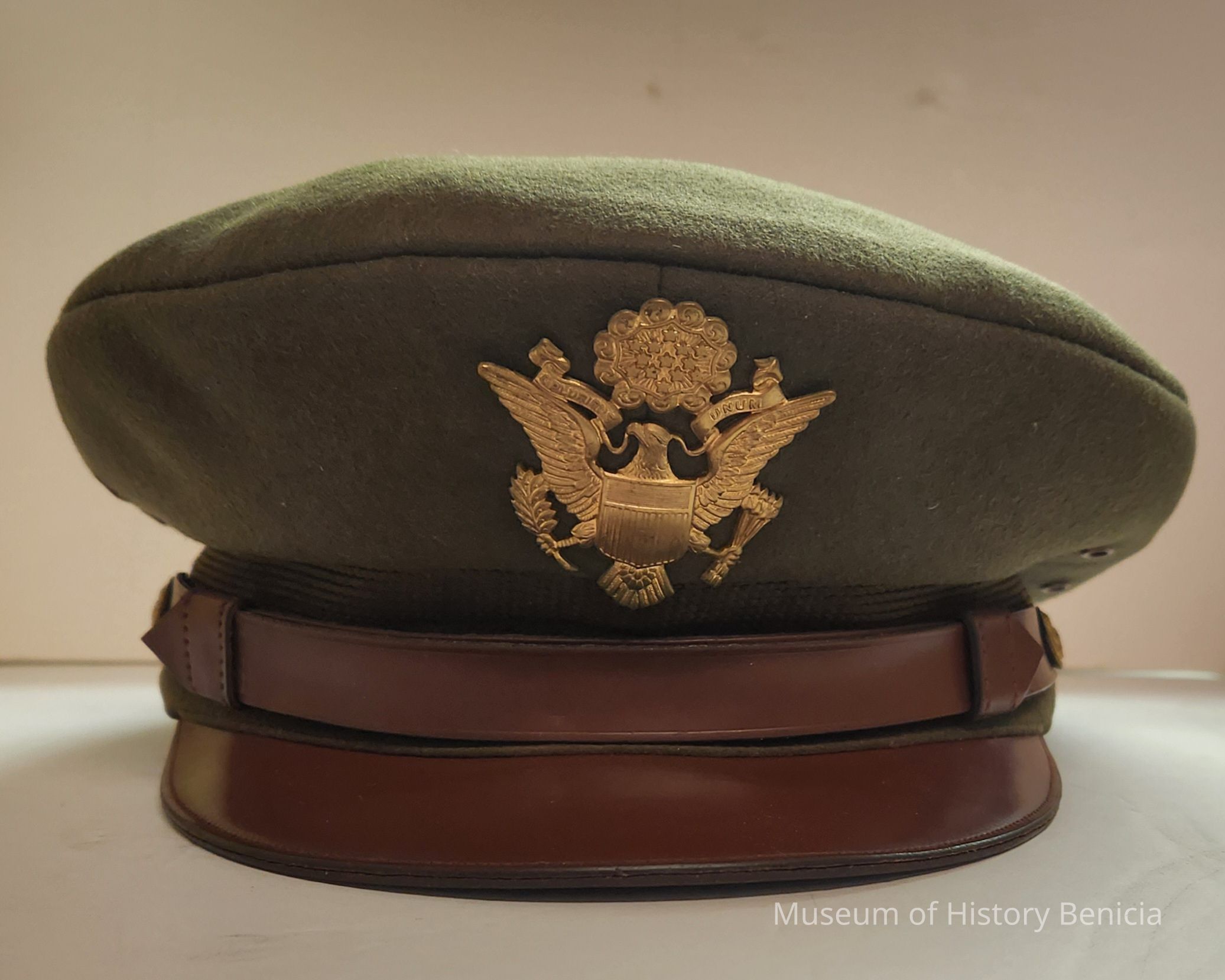 Officer's green wool hat, leather visor, leather strap with brass buttons at ends on sides;