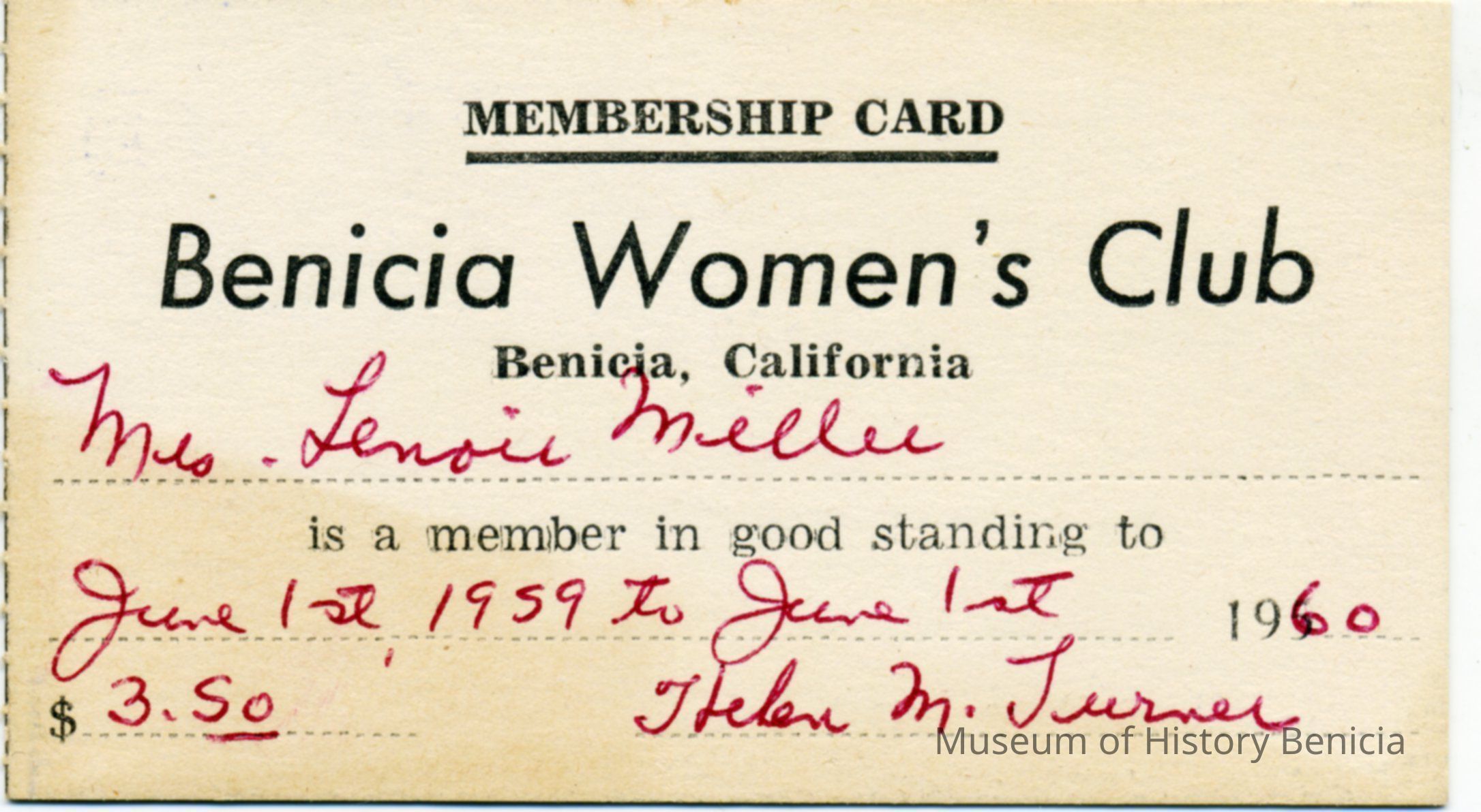 This is a membership card for the Benicia Women's Club dated 1960. It belonged to Mrs. Lenoir Miller and was signed by Helen M. Turner. The cost of membership was $3.50.Collection