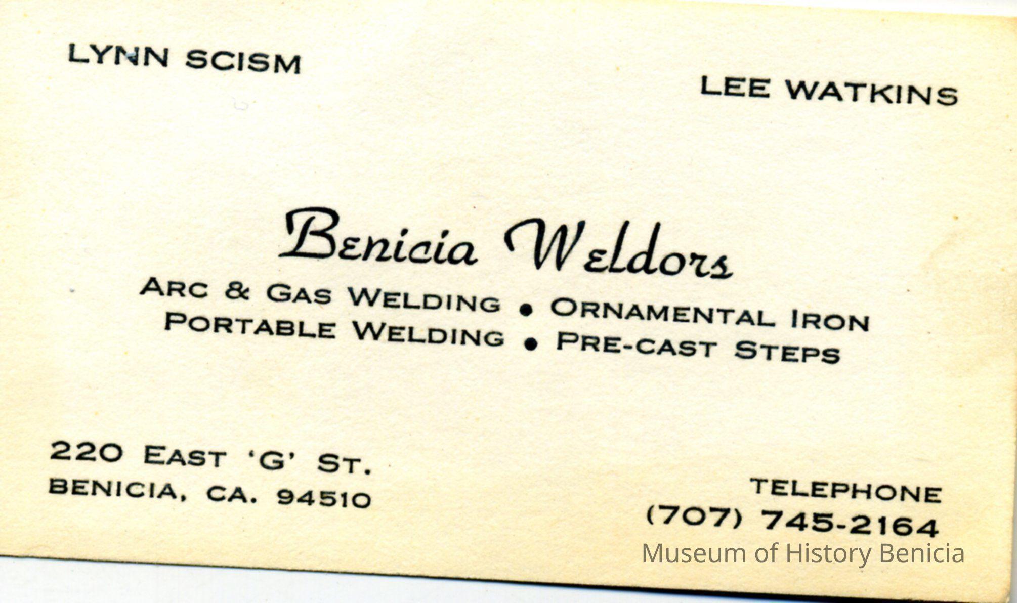 This is a business card for the Benicia Weldor shop and Lynn Scism.