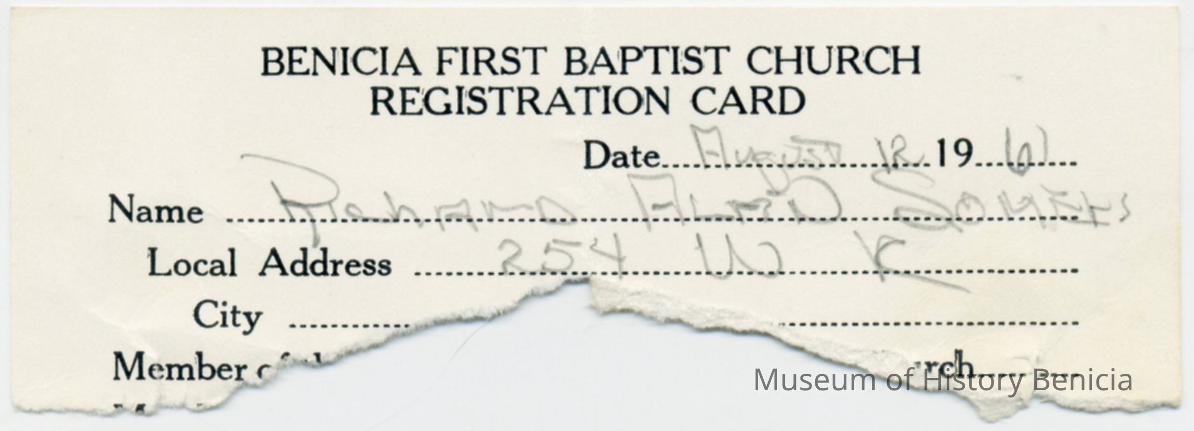 1. torn Benicia First Baptist Church Registration card 08/12/1961