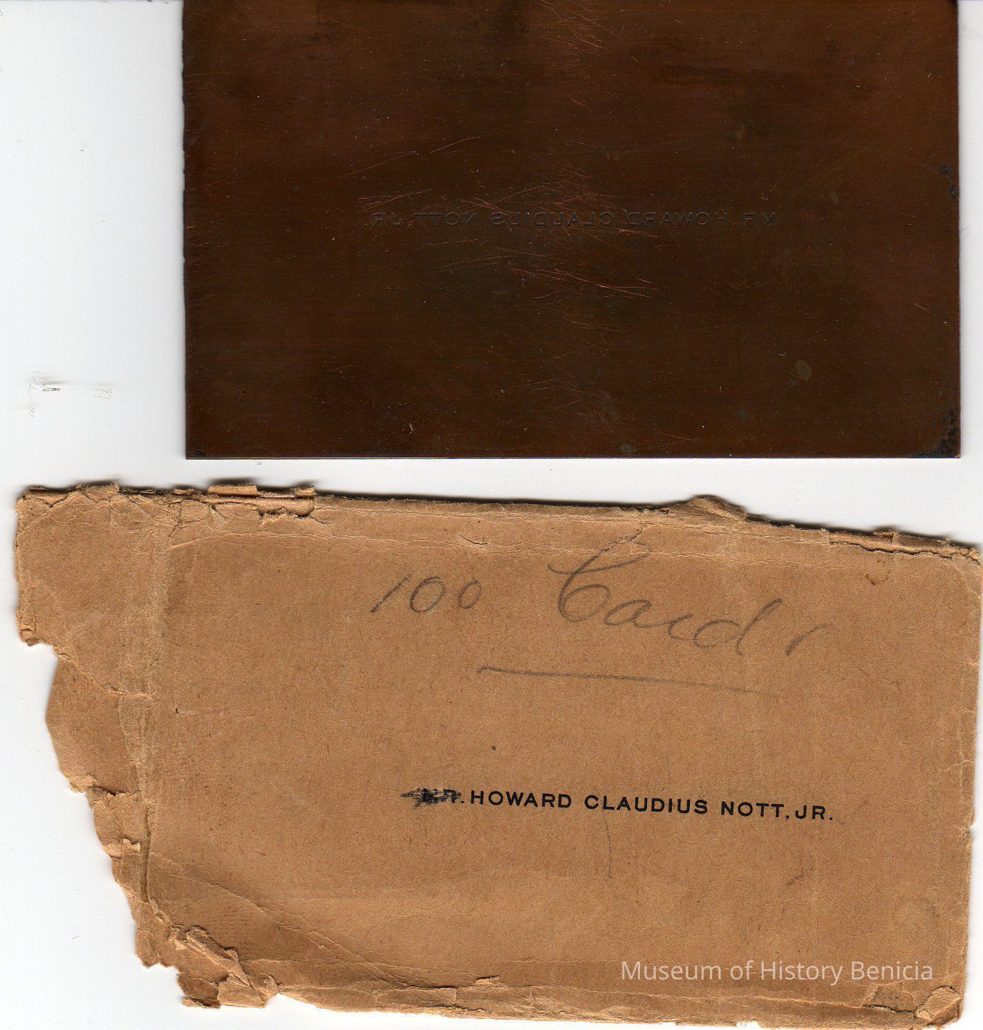 Copper calling card maser in a paper cover that has written in black "Mr. Howard C. Nott, Jr. (Mr. is scratched out)" and written in pencil is "100 cards"Collection