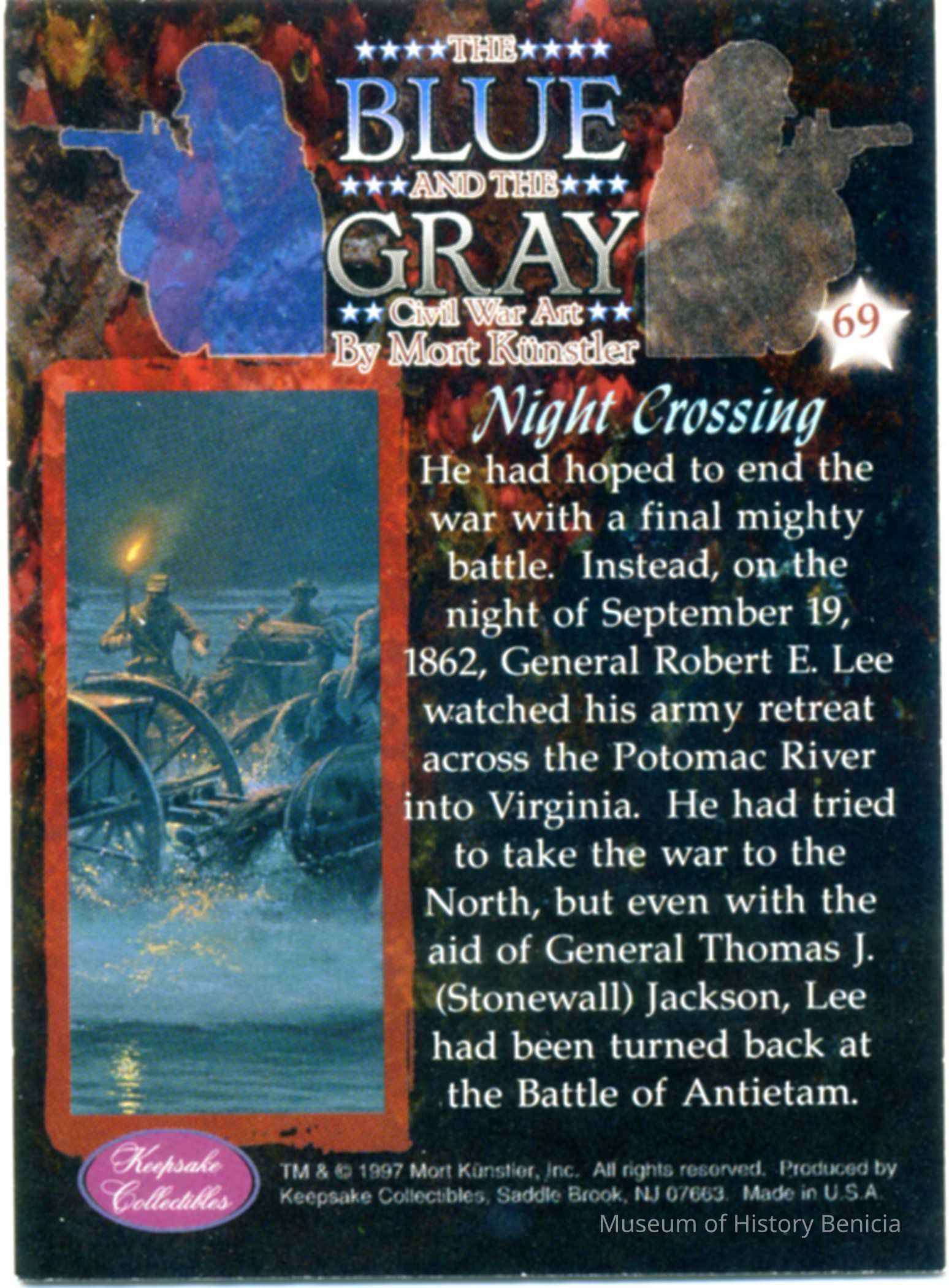 This card (#69) is called "Night Crossing". It talks about the Southern attempt to end the war and take the battle to the North. Instead, Lee was turned back at the battle of Antietam and forced to cross the Potomac River. There are two of these cards.Collection