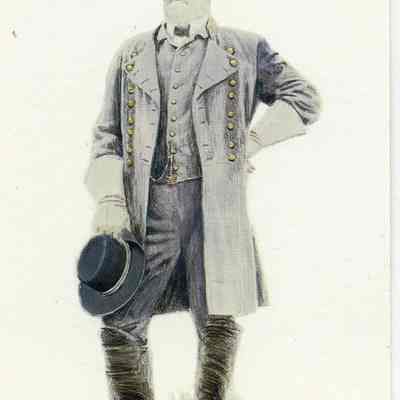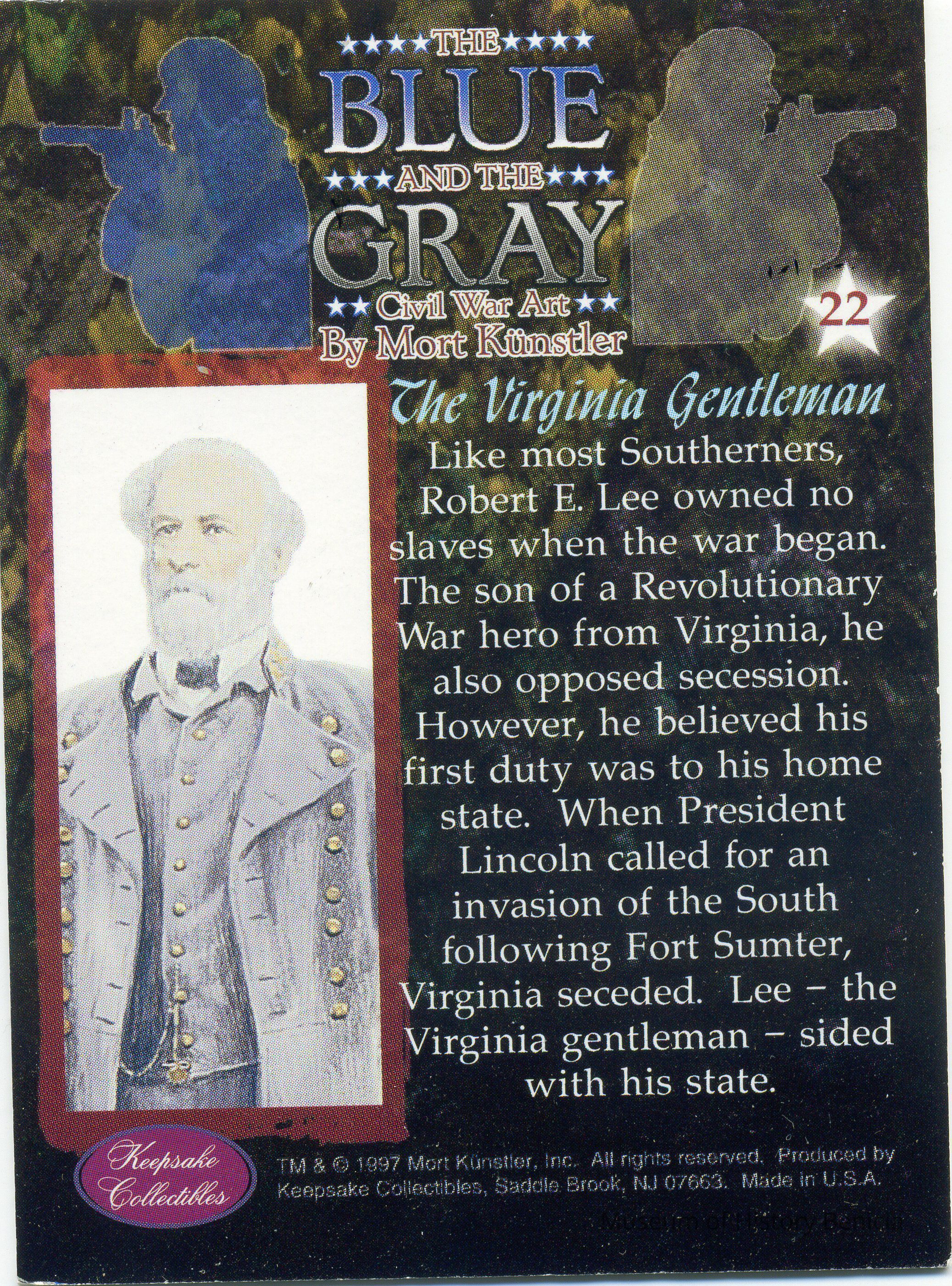 A collectors card for the Civil War from the Keepsake Collectibles company. The set is called "The Blue and the Gray - Civil War Art by Mort Kunstler. Each card has a scene/person on one side and the history of that scene or person on the other side.