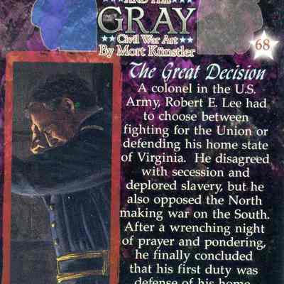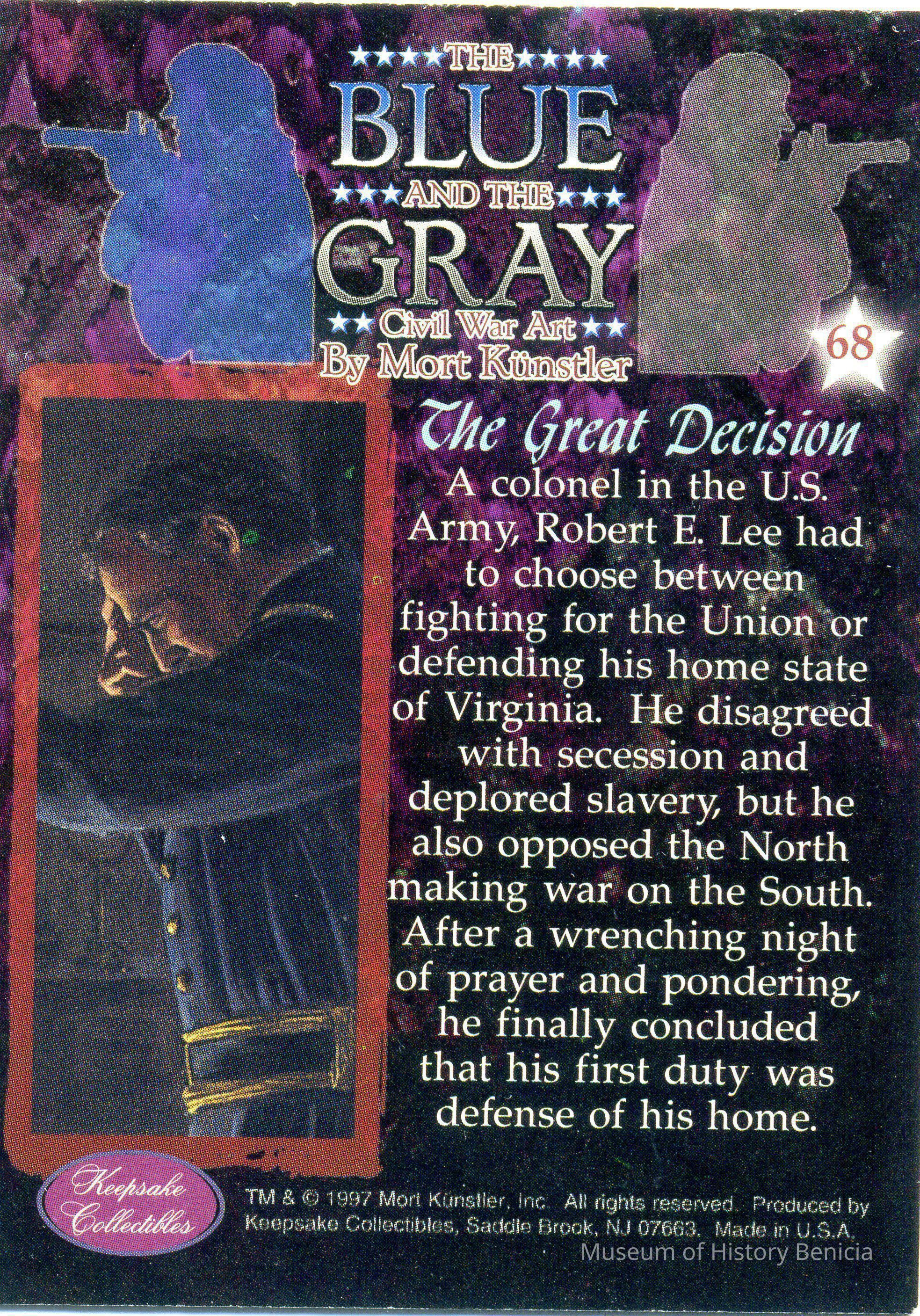 This card (#68) is about Gen. Robert E. Lee. The card is called "The Great Decision".There are three of these cards.Collection