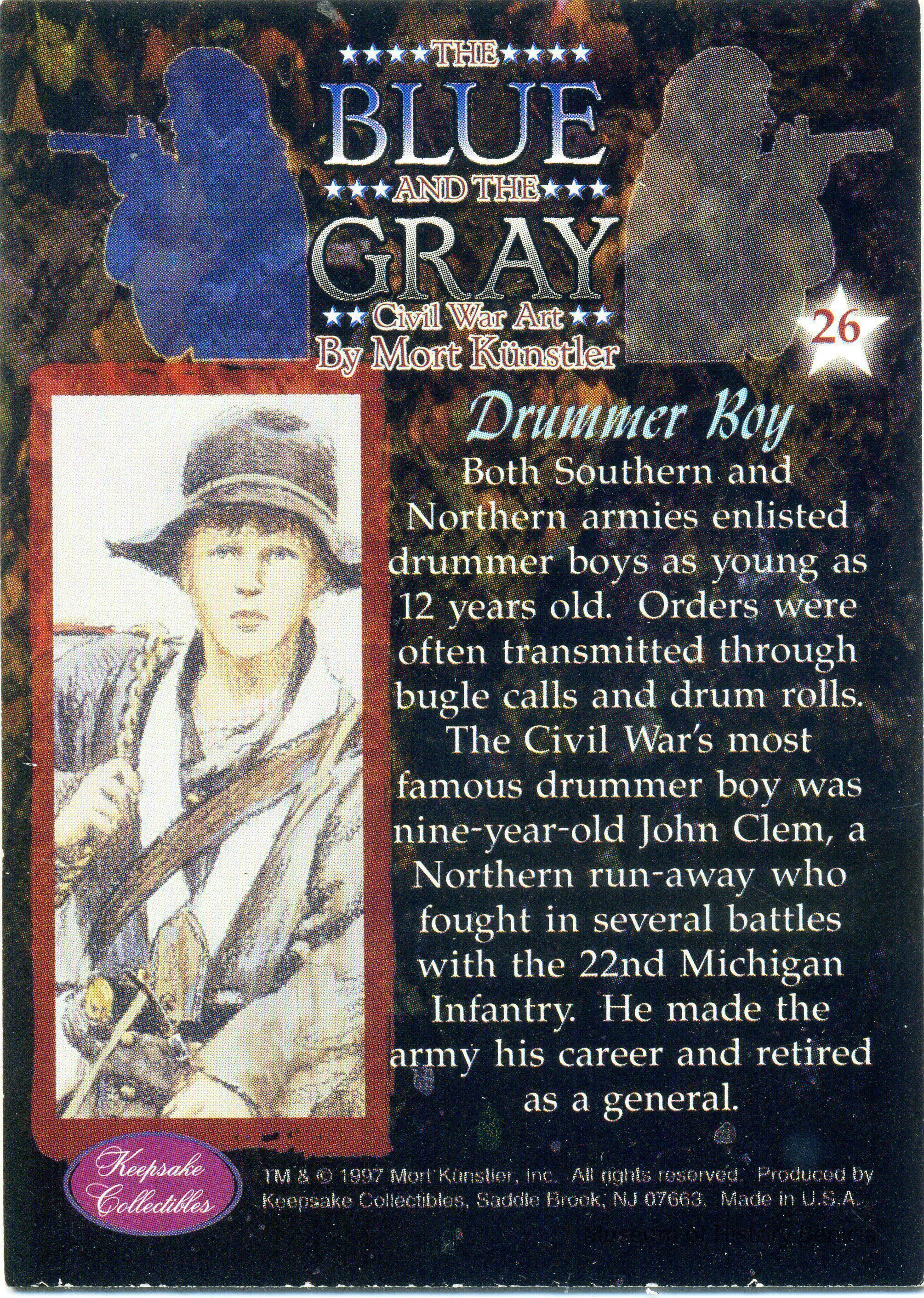 This card (#26) is called "The Drummer Boy". It talks about the young recruits and one famous drummer boy, John Clem. There is only one copy of this card.Collection