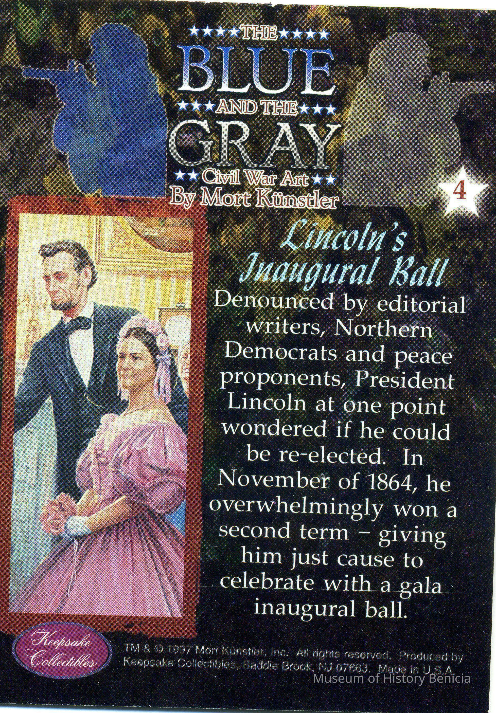 This card (#4) is called "Lincoln's Inaugural Ball". It talks about overwhelming victory Lincoln had for his second term and the ball he used to celebrate victory. There is only one copy of this card.Collection