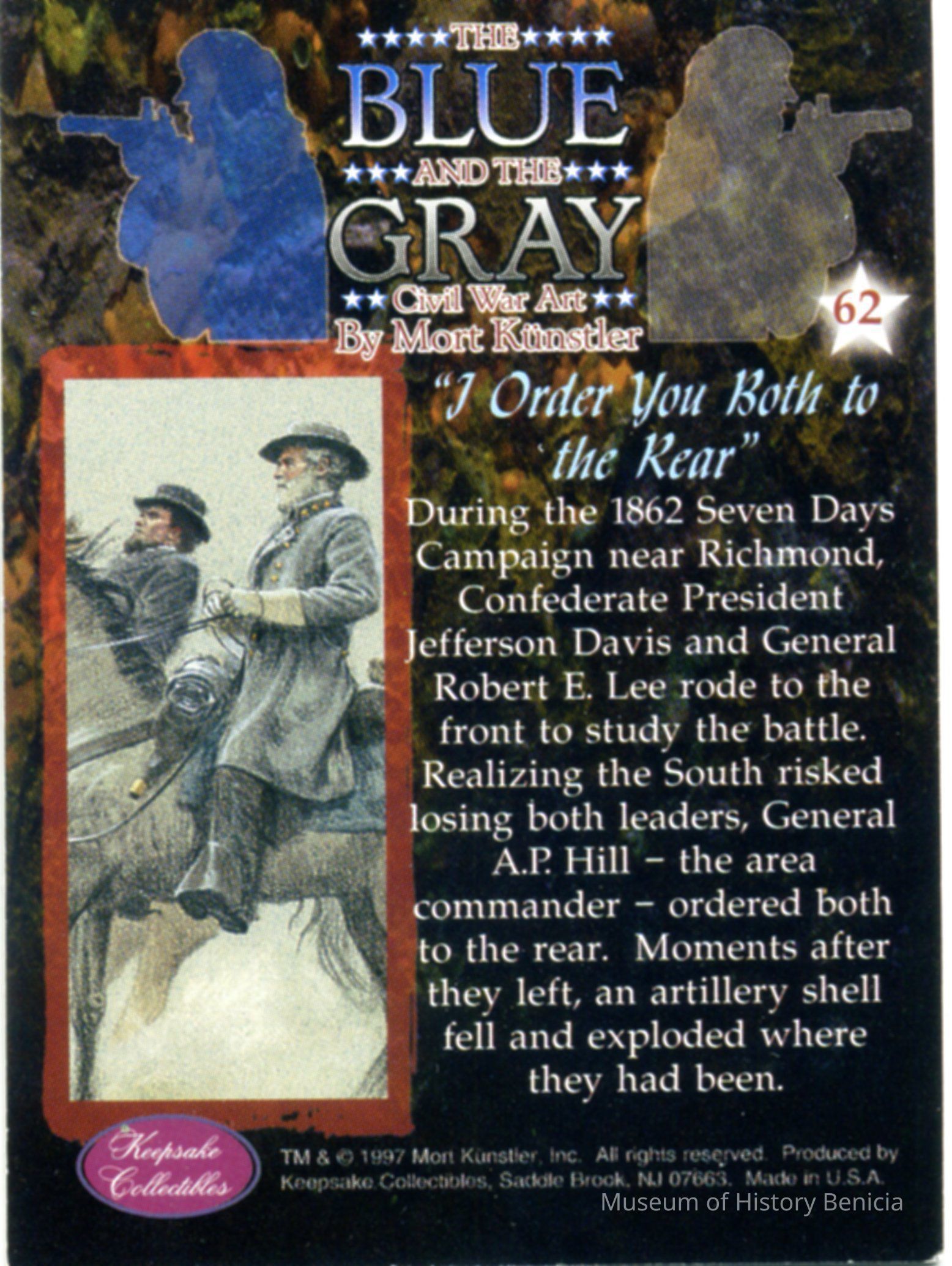 This card (#62) is called "I Order You Both to the Rear". It talks about Gen Hill ordered President Davis and General Lee away from the battle lines in 1862 during the Seven Days Campaign. There are three of these cards.Collection