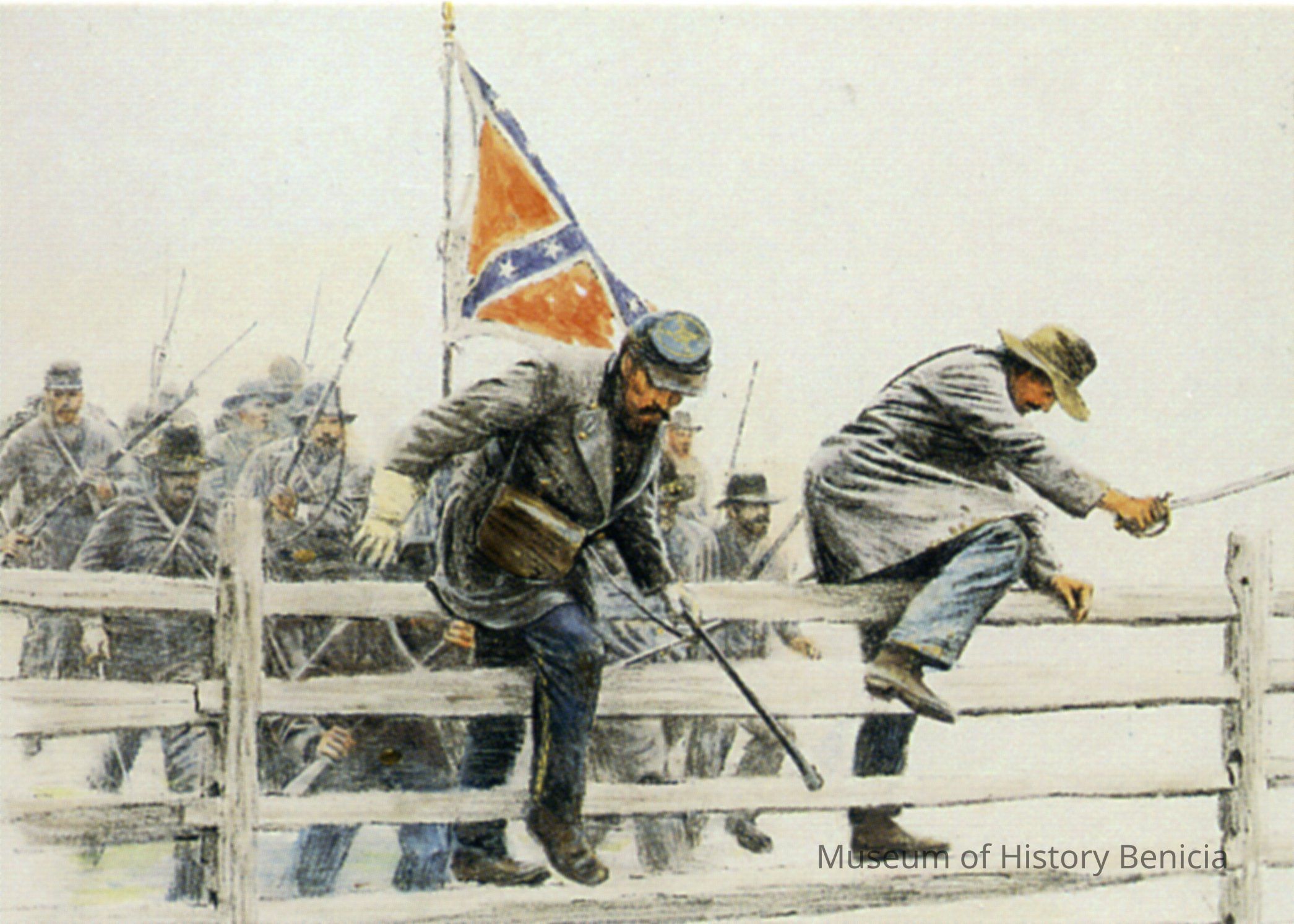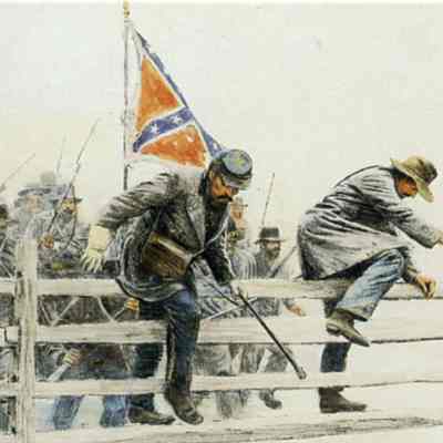 This card (#43) is called "The Fence". It talks about the Southern attack called Pickett's charge where 13,000 Southern soldiers died. They had to climb over a rail fence in the middle of the advance. There are two of these cards.Collection