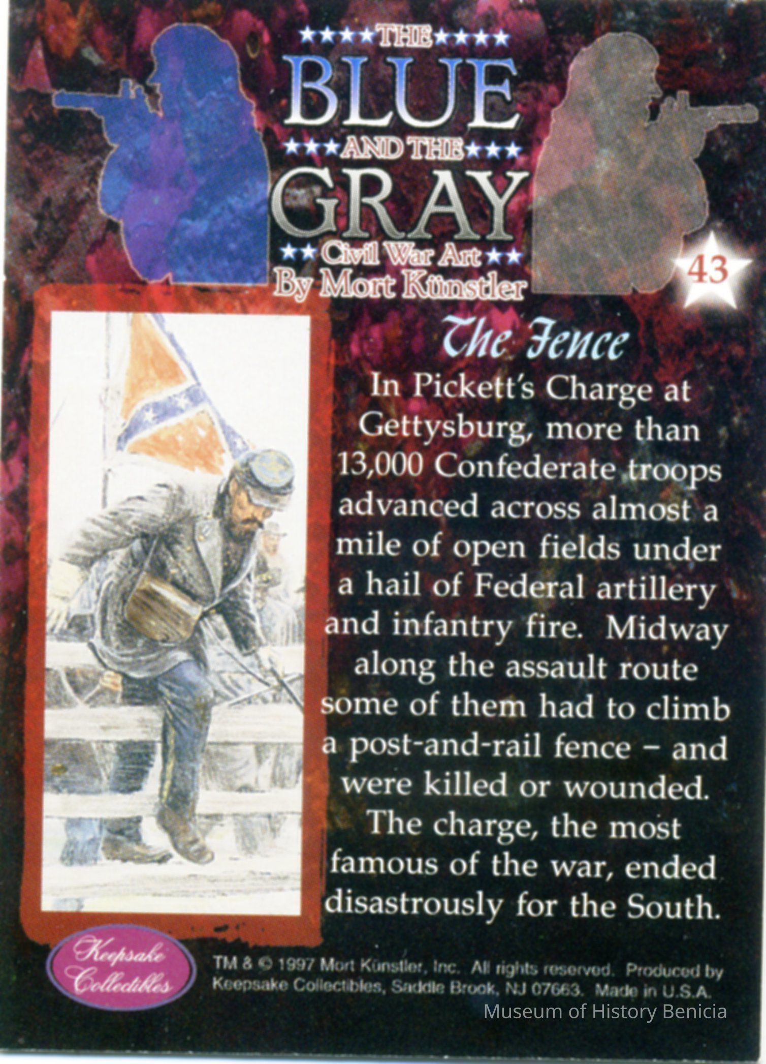 A collectors card for the Civil War from the Keepsake Collectibles company. The set is called "The Blue and the Gray - Civil War Art by Mort Kunstler. Each card has a scene/person on one side and the history of that scene or person on the other side.