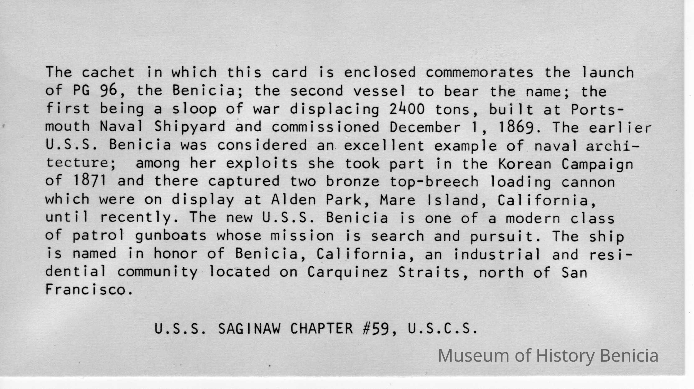 Card tells the history of the first vessel called the Benicia, which took part in the Korean campaign of 1871. The new Benicia, it says, "is one of a modern class of patrol gunboats whose mission is search and pursuit. The ship is named in honor of Benicia, California, an industrial and residential community located on Carquinez Straits, north of San Francisco."Collection