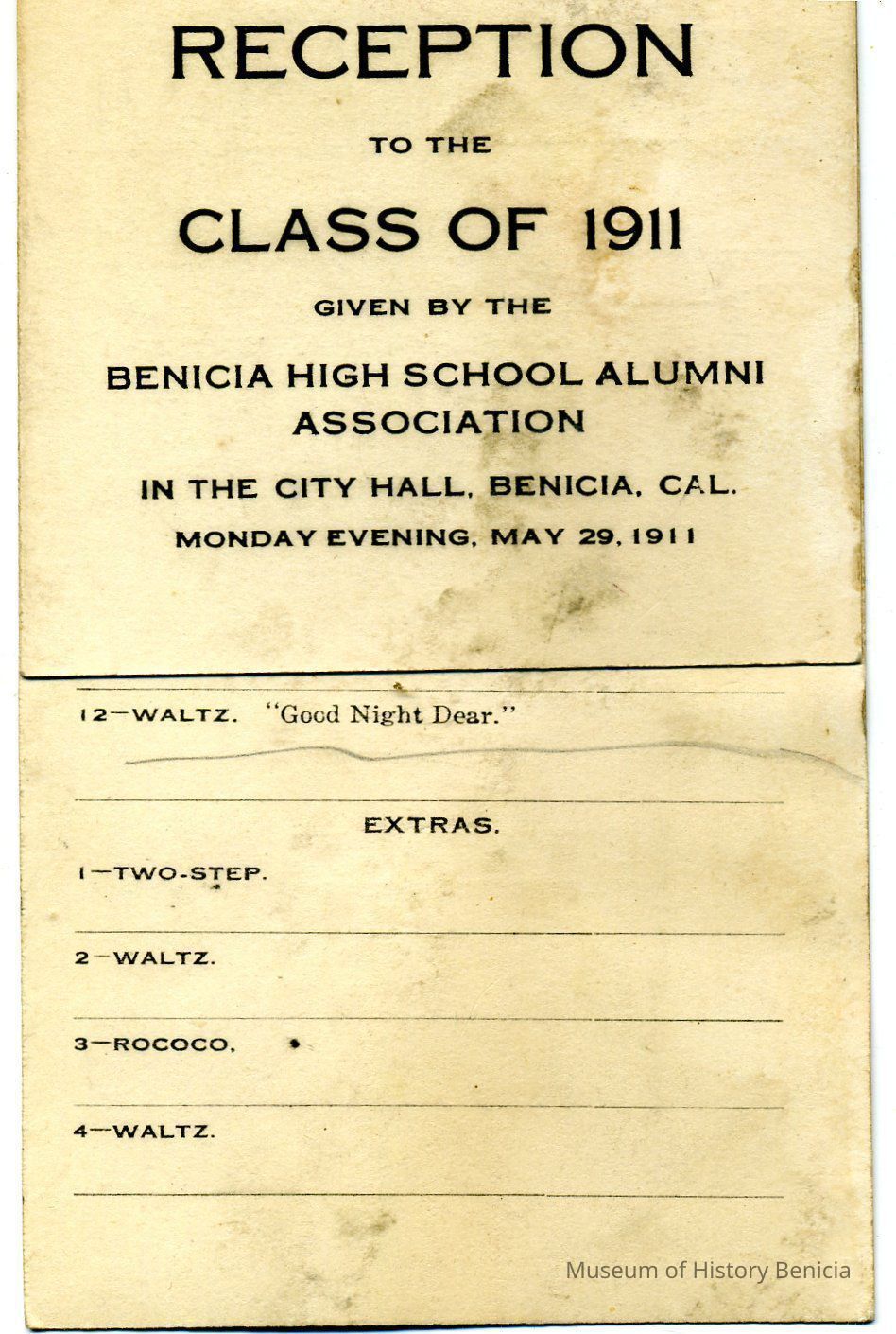Dance Card for "Reception to the Class of 1911 / Given by the Benicia High School Alumni Association / in the City Hall, Benicia, Cal. / Monday Evening May 29, 1911