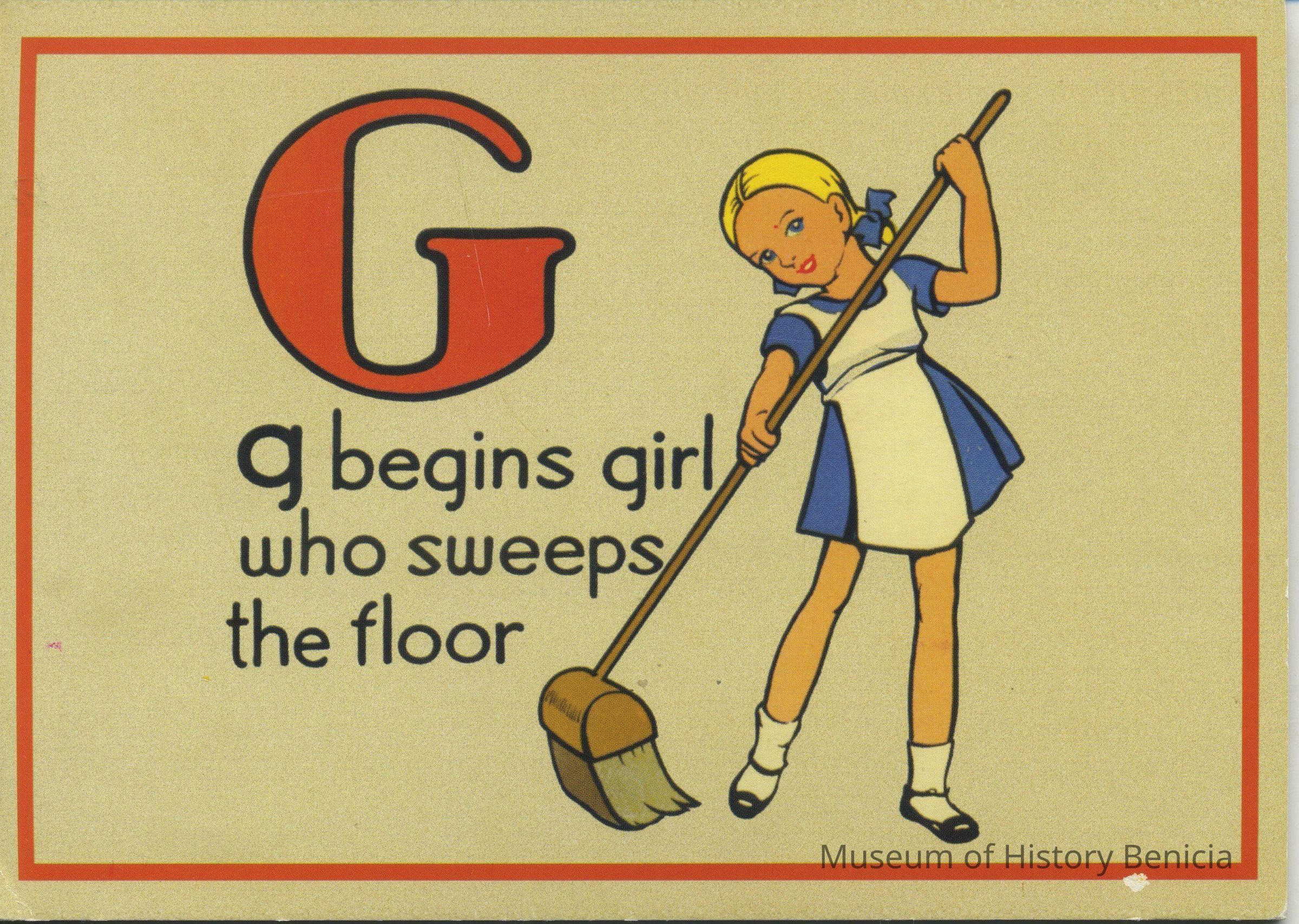Flash Card - for classroom use Large G - "g begins girl who sweeps the floor" with a picture of a girl with a broom stiff card stock, 4-3/4" x 6-1/2"