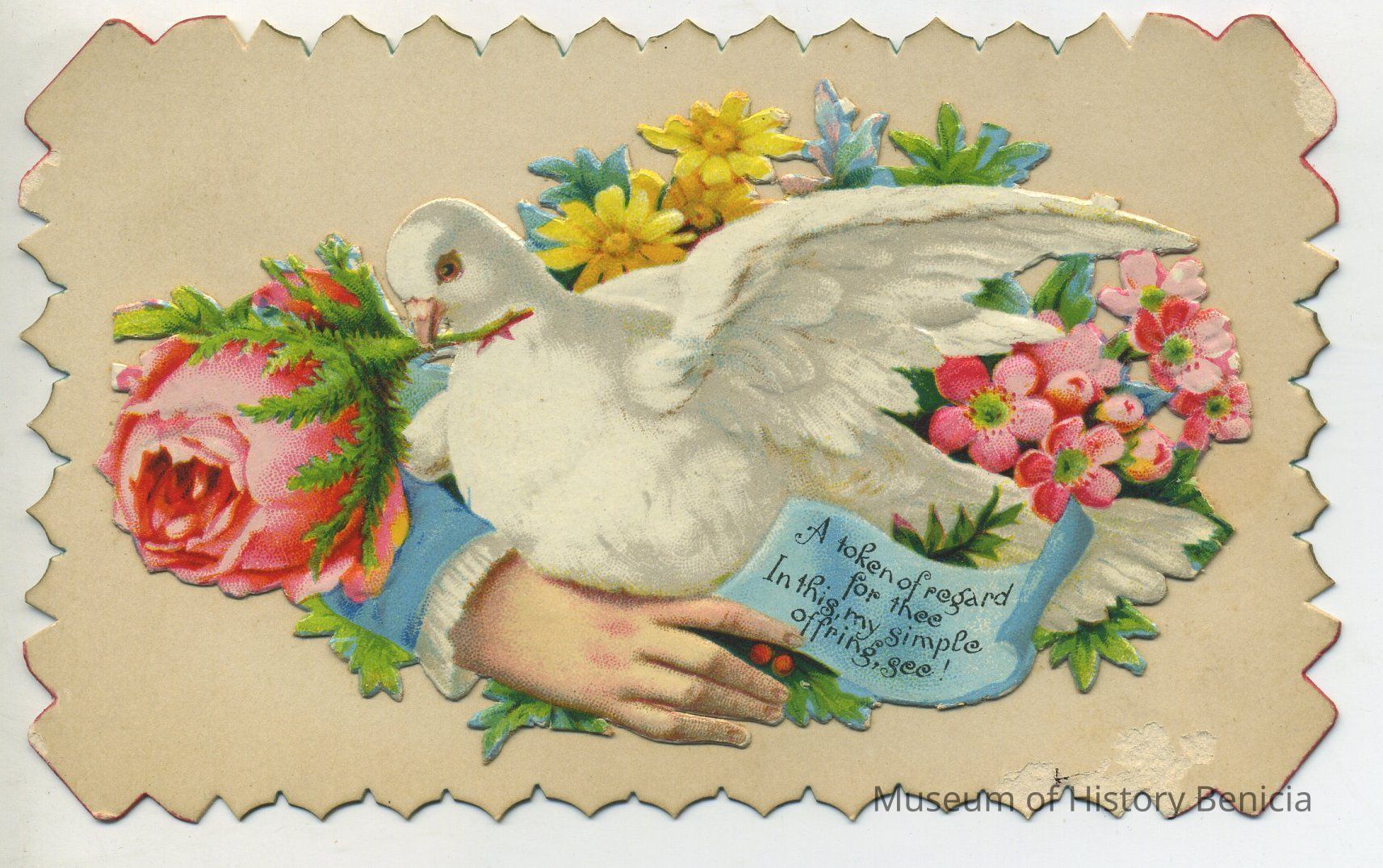 Front: Cutout: Dove with a rose in its beak resting on a hand;