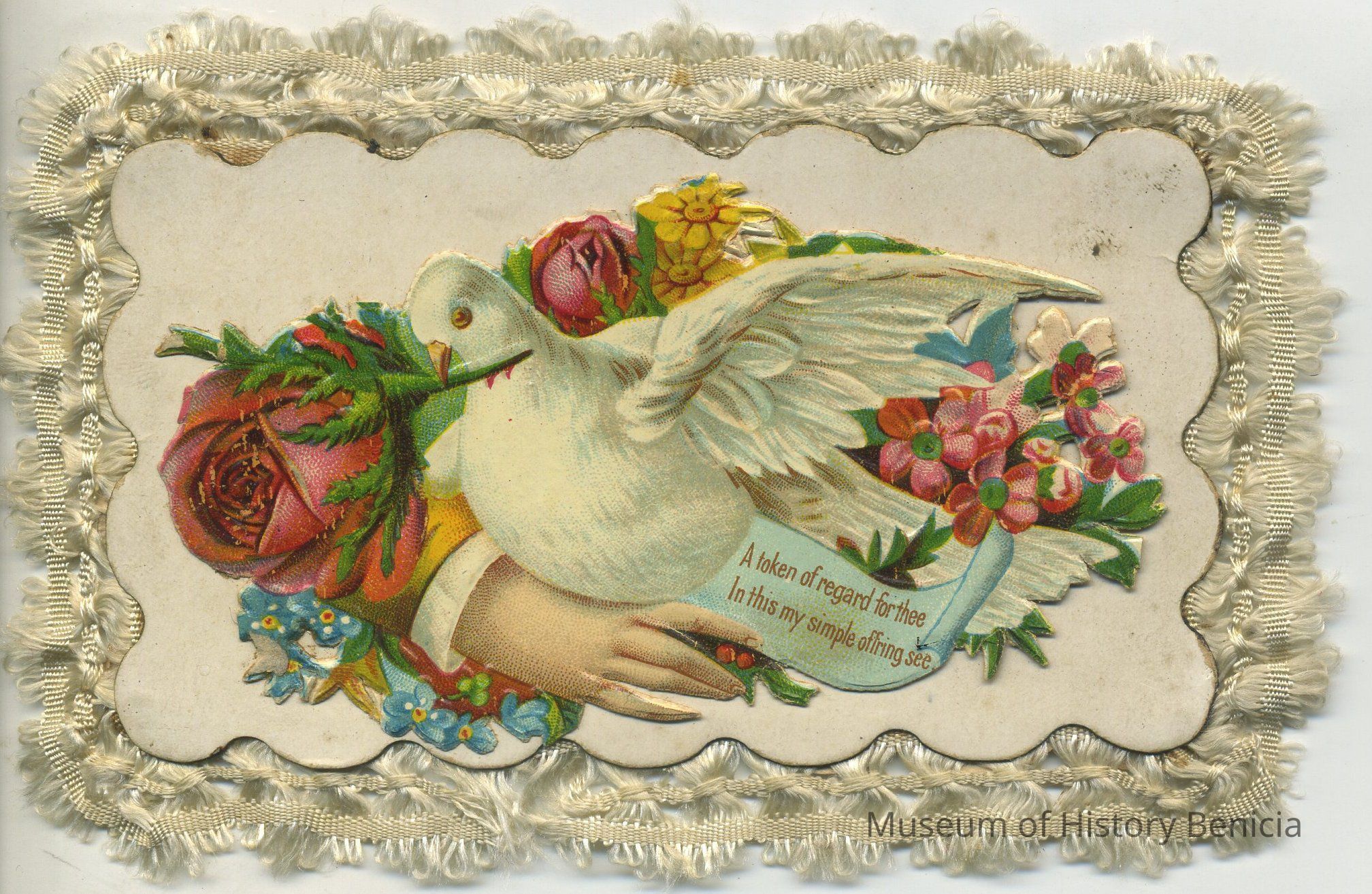 Front: Cutout: Dove with a rose in its beak resting on a hand;