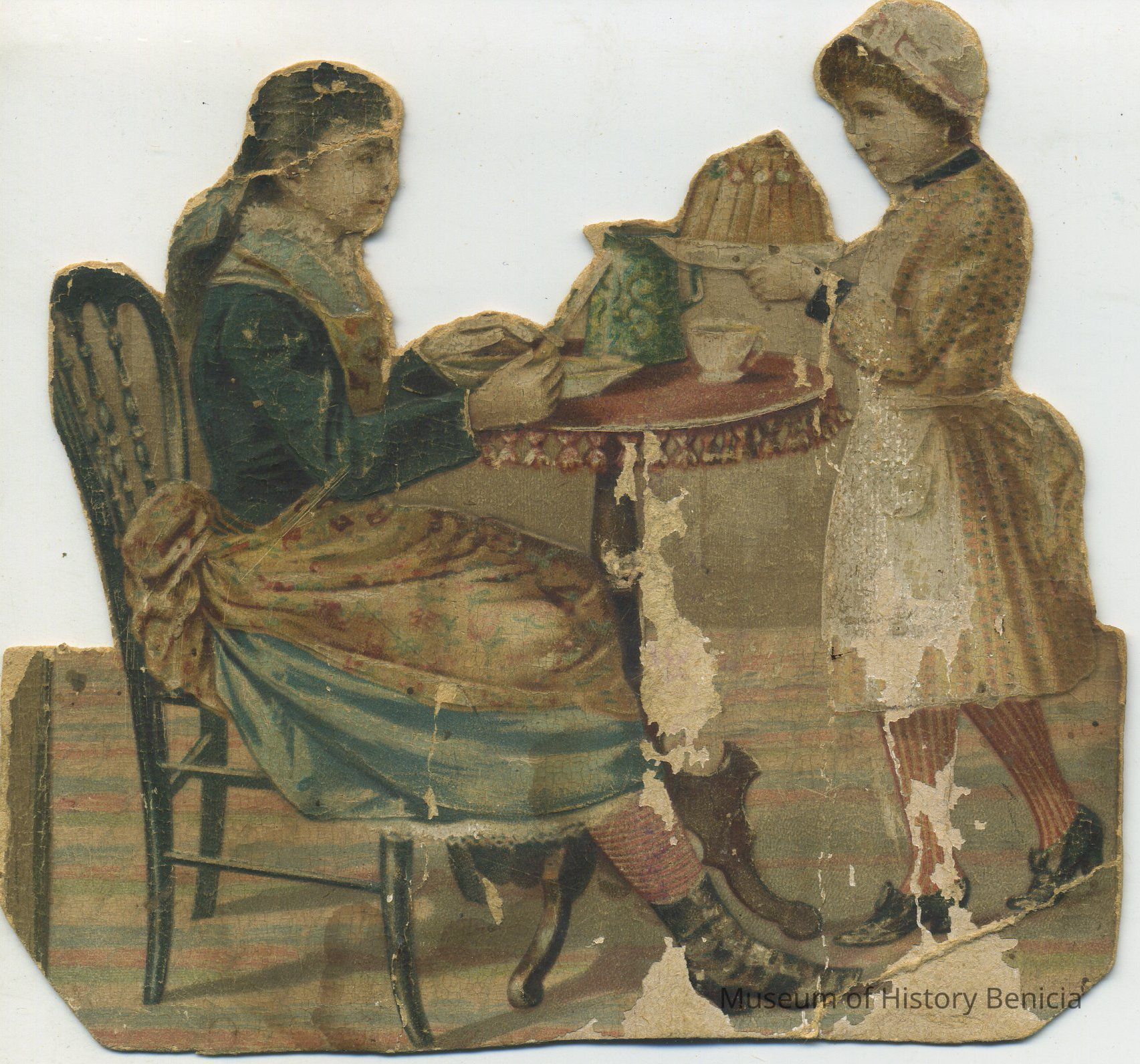A section of a greeting card in faded colors - shows a woman seated at a table and another woman (a maid?) holding a cake;