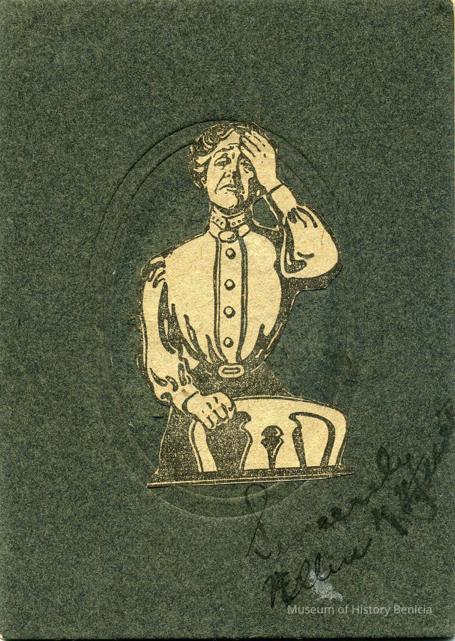 Grey cardboard mat with drawing of a woman with one hand on her forehead and the other on the back of a chair (style could be a school teacher) cut from newspaper and clued on in place of a photo.