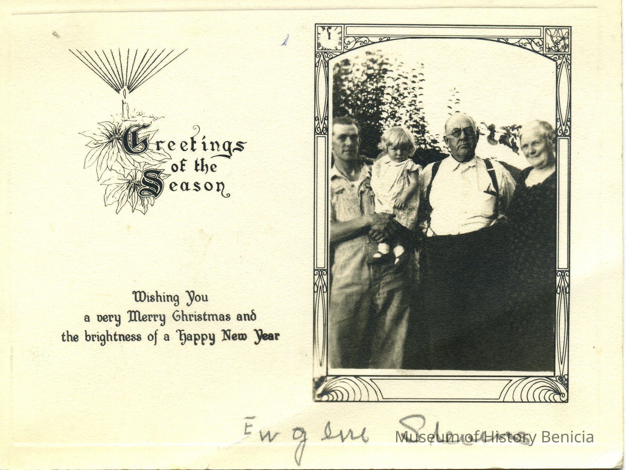 B/W Photograph of an older man and woman with a young man holding a small child;