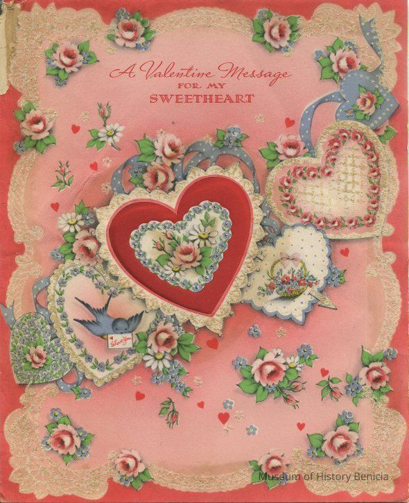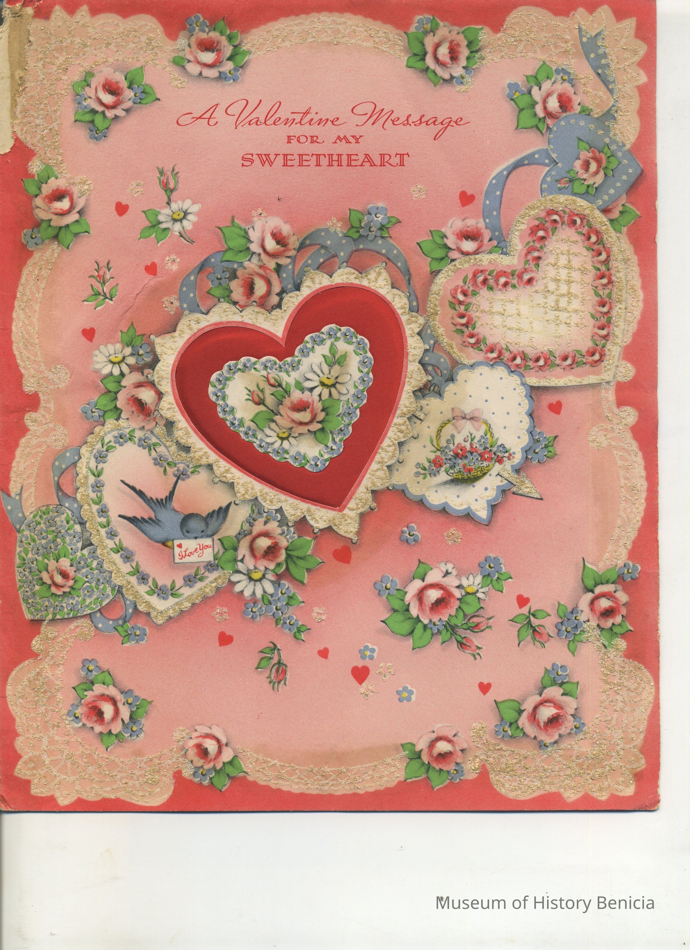 "A Valentine Message for My Sweetheart" on front with hearts, flowers, lace etc. with glitter;