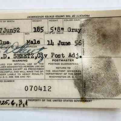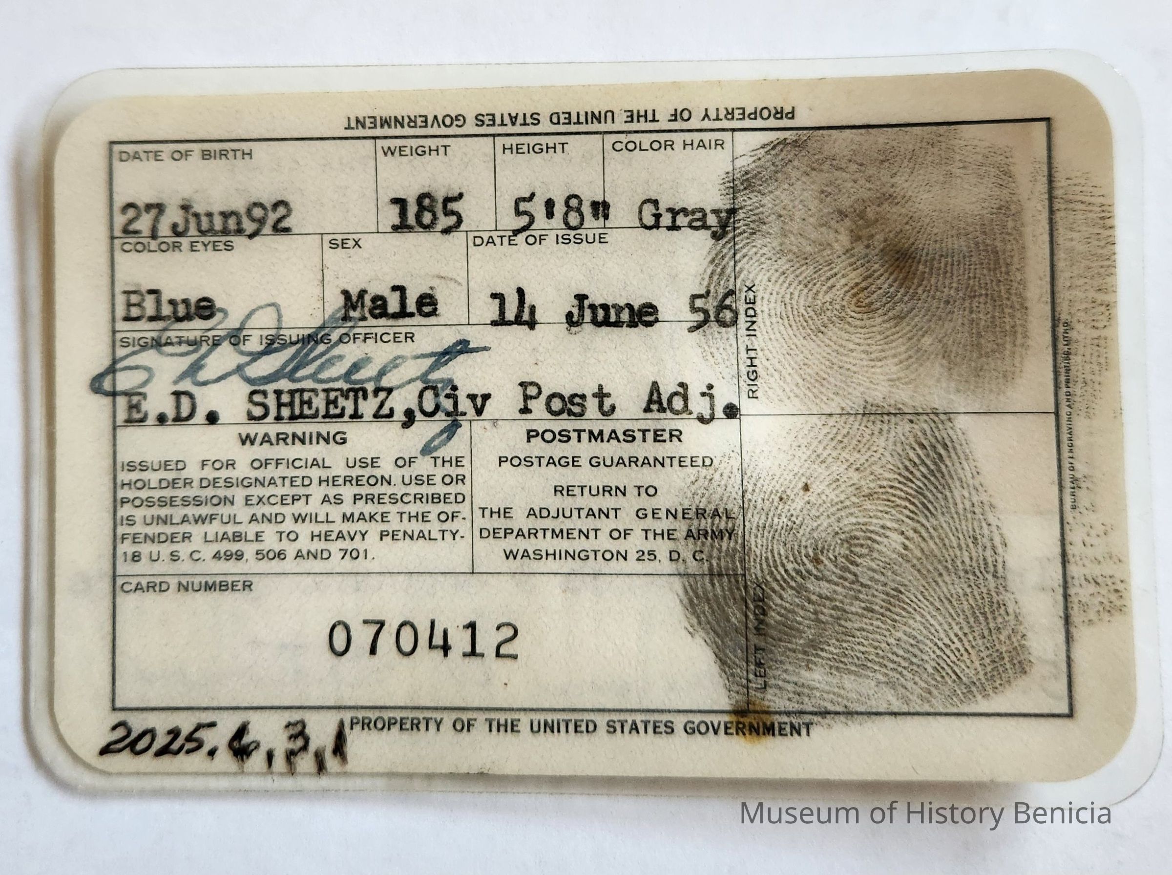 Back: Date of Birth: 27 Jun 92, Weight 185, Height 5'8" / Color hair Gray / Color eyes Blue / Sex Male / Date of Issue 14 June 56 / signature of issuing officer E.D. Sheetz, Civ Post Adj [with signature]; includes info if ID is lost, etc. / card number 070412 and two thumb printsCollection