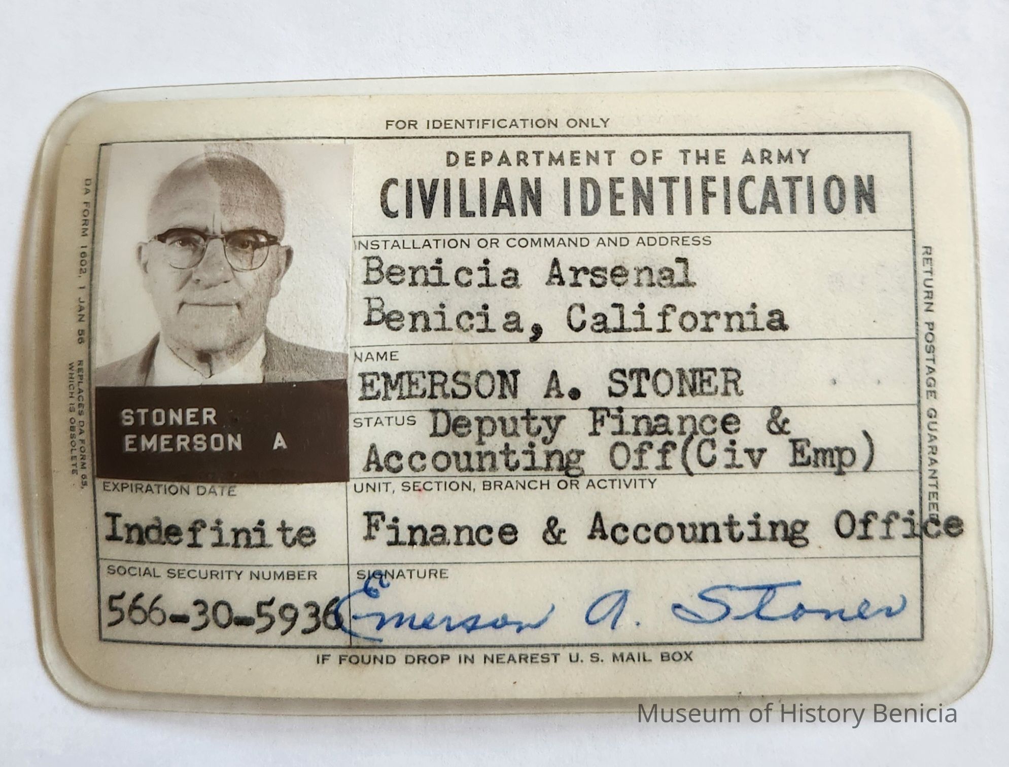 Front: Benicia Arsenal Benicia, California / Emerson A. Stoner / Deputy Finance & Accounting Office (Civ Emp) / Finance & Accounting Office / SSN xxx-xx-xxxx [signed] Emerson A. Stoner